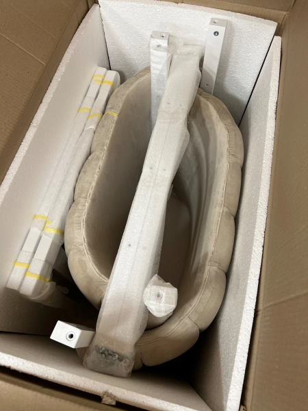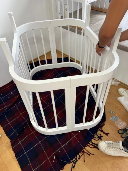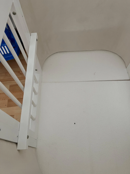 - Doporučujeme na zem položit polystyreny, které byly v krabici jako výplň. Na tyto polystyreny položte horní hranou postýlku, montáž bude jednodušší.