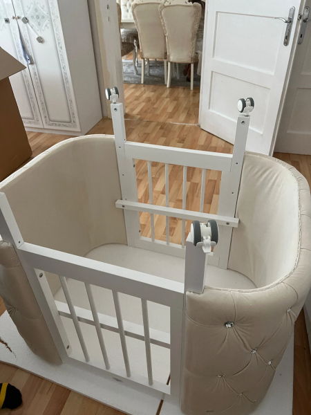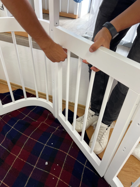- Dřevěný prostřední díl je třeba šrouby přimontovat k bočnici postýlky.