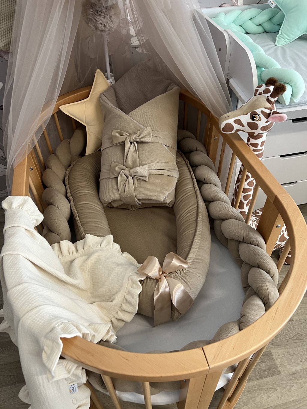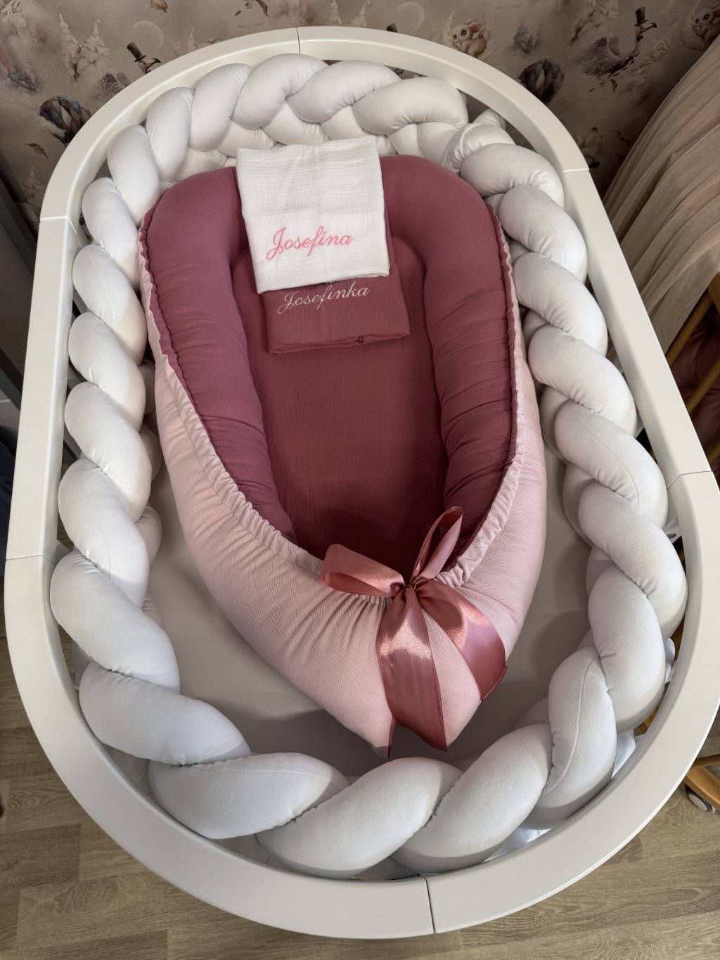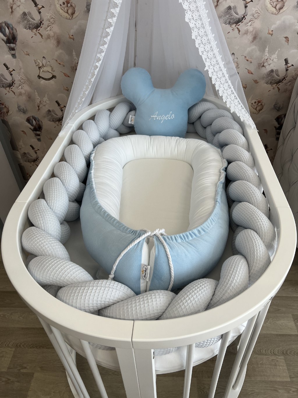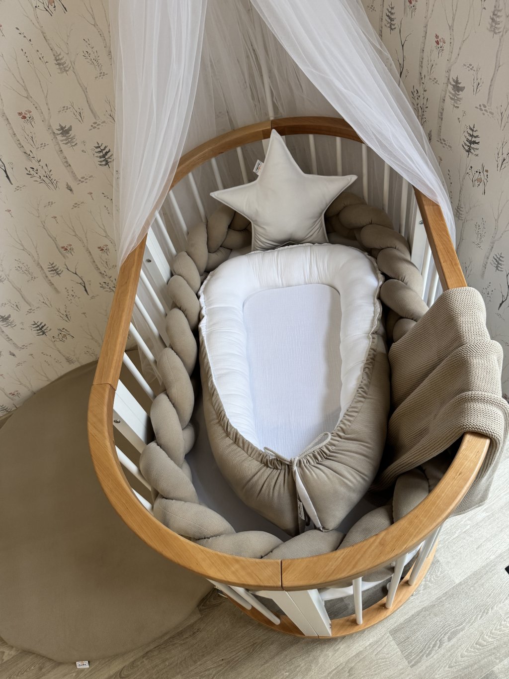 Pokud stavíte kulatou variantu postýlky, hnízdečko po vložení vyplní celý vnitřní prostor kulatého tvaru. Mantinel se v tomto případě do postýlky již nevejde, zároveň to ale není potřeba – měkké a vyvýšené boky hnízdečka plně nahrazují jeho funkci a chrání miminko před kontaktem s dřevěnými tyčkami.