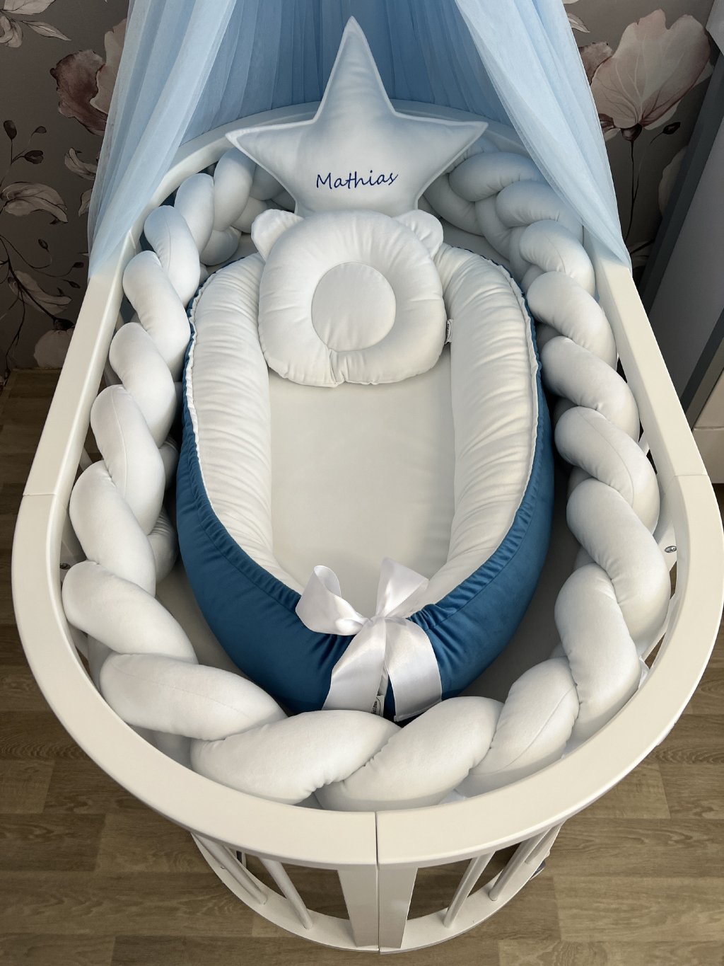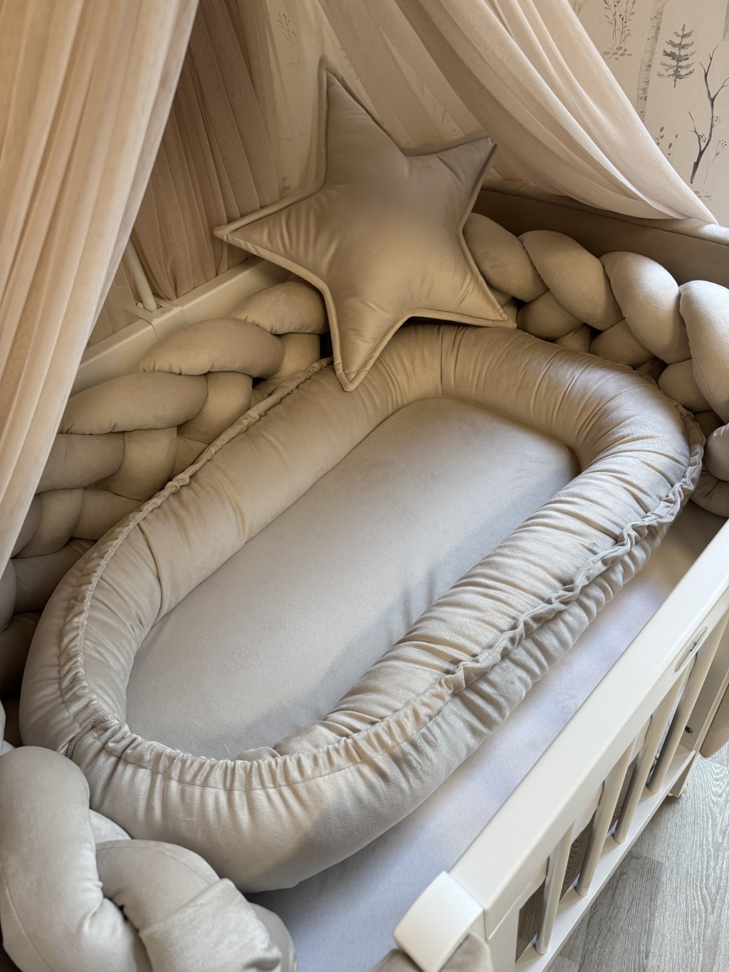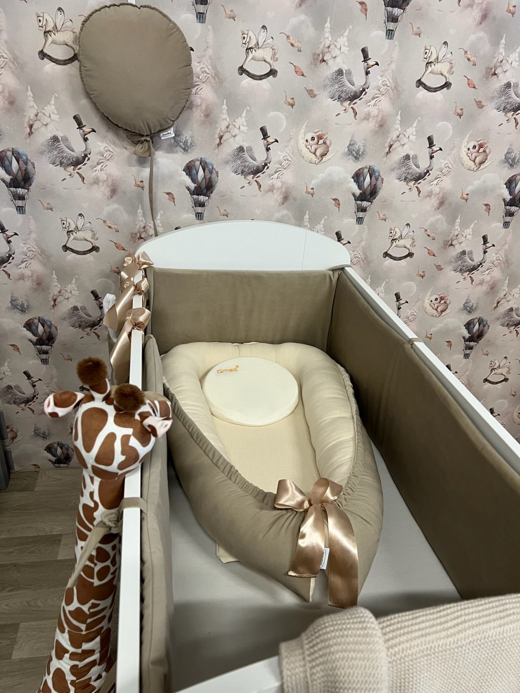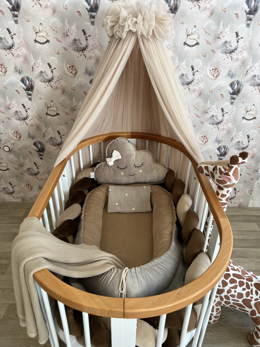 Pokud stavíte kulatou variantu postýlky, hnízdečko po vložení vyplní celý vnitřní prostor kulatého tvaru. Mantinel se v tomto případě do postýlky již nevejde, zároveň to ale není potřeba – měkké a vyvýšené boky hnízdečka plně nahrazují jeho funkci a chrání miminko před kontaktem s dřevěnými tyčkami.