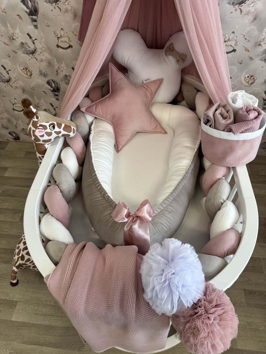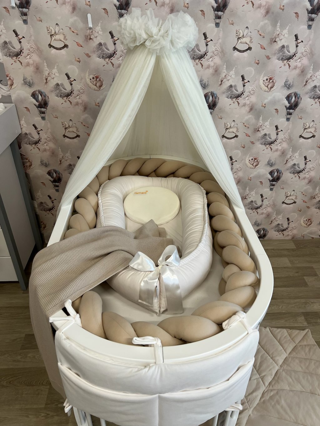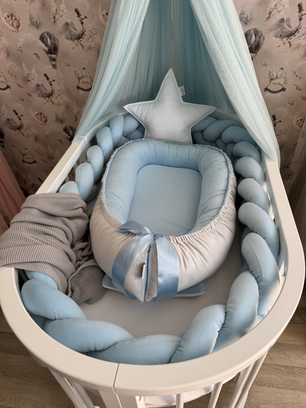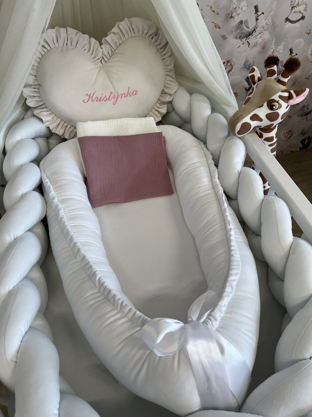 Pokud stavíte kulatou variantu postýlky, hnízdečko po vložení vyplní celý vnitřní prostor kulatého tvaru. Mantinel se v tomto případě do postýlky již nevejde, zároveň to ale není potřeba – měkké a vyvýšené boky hnízdečka plně nahrazují jeho funkci a chrání miminko před kontaktem s dřevěnými tyčkami.