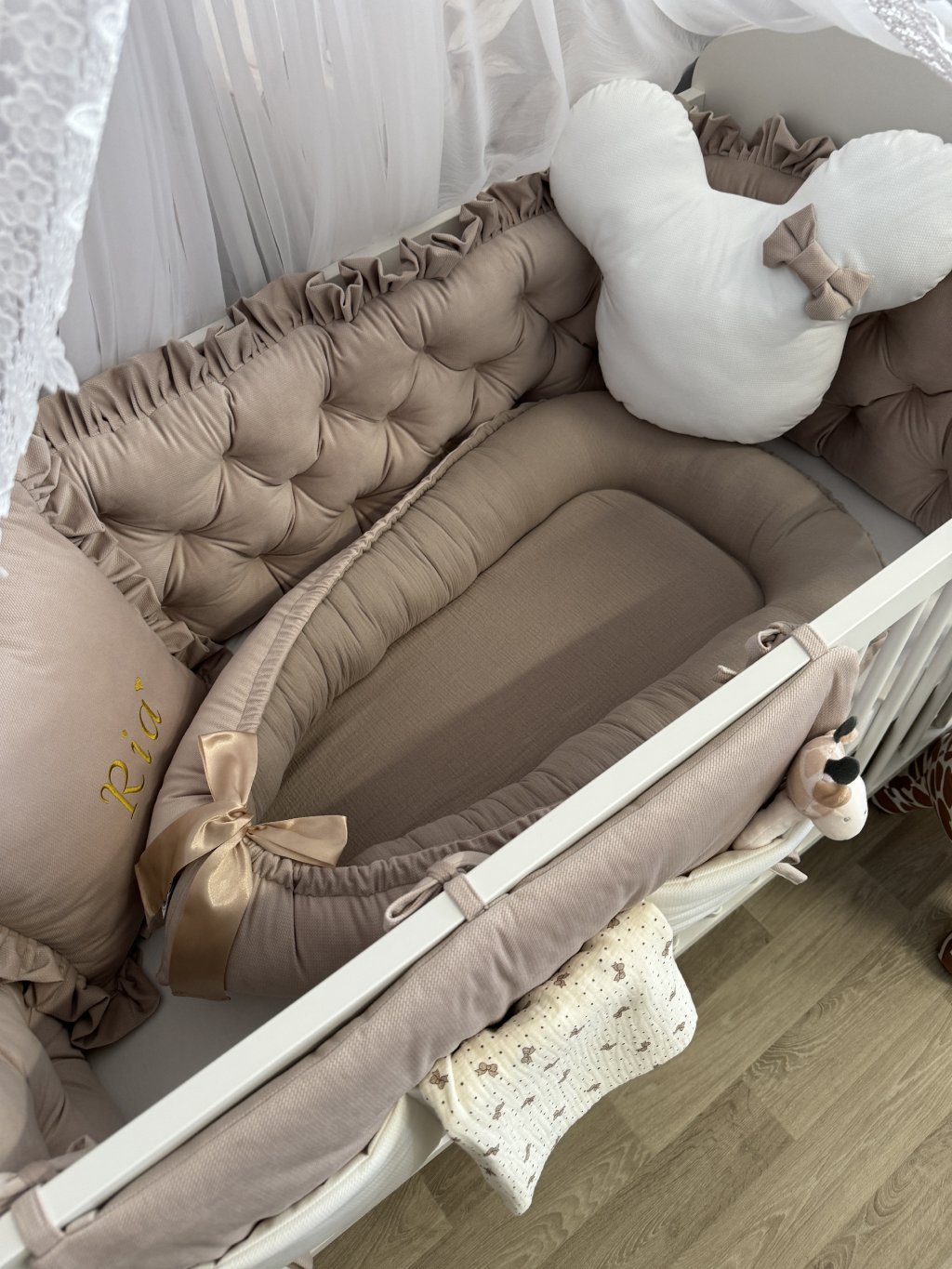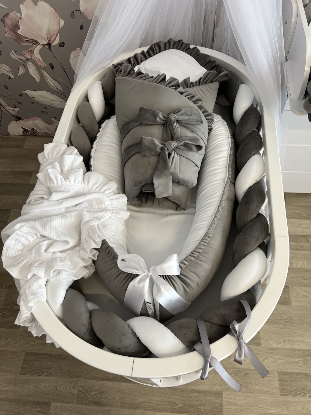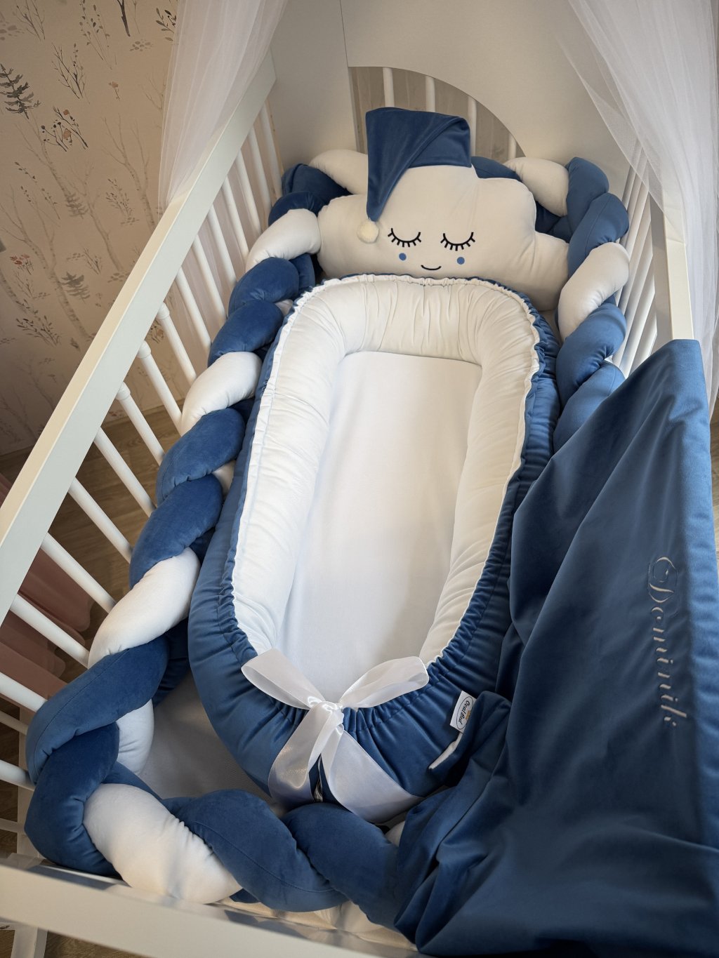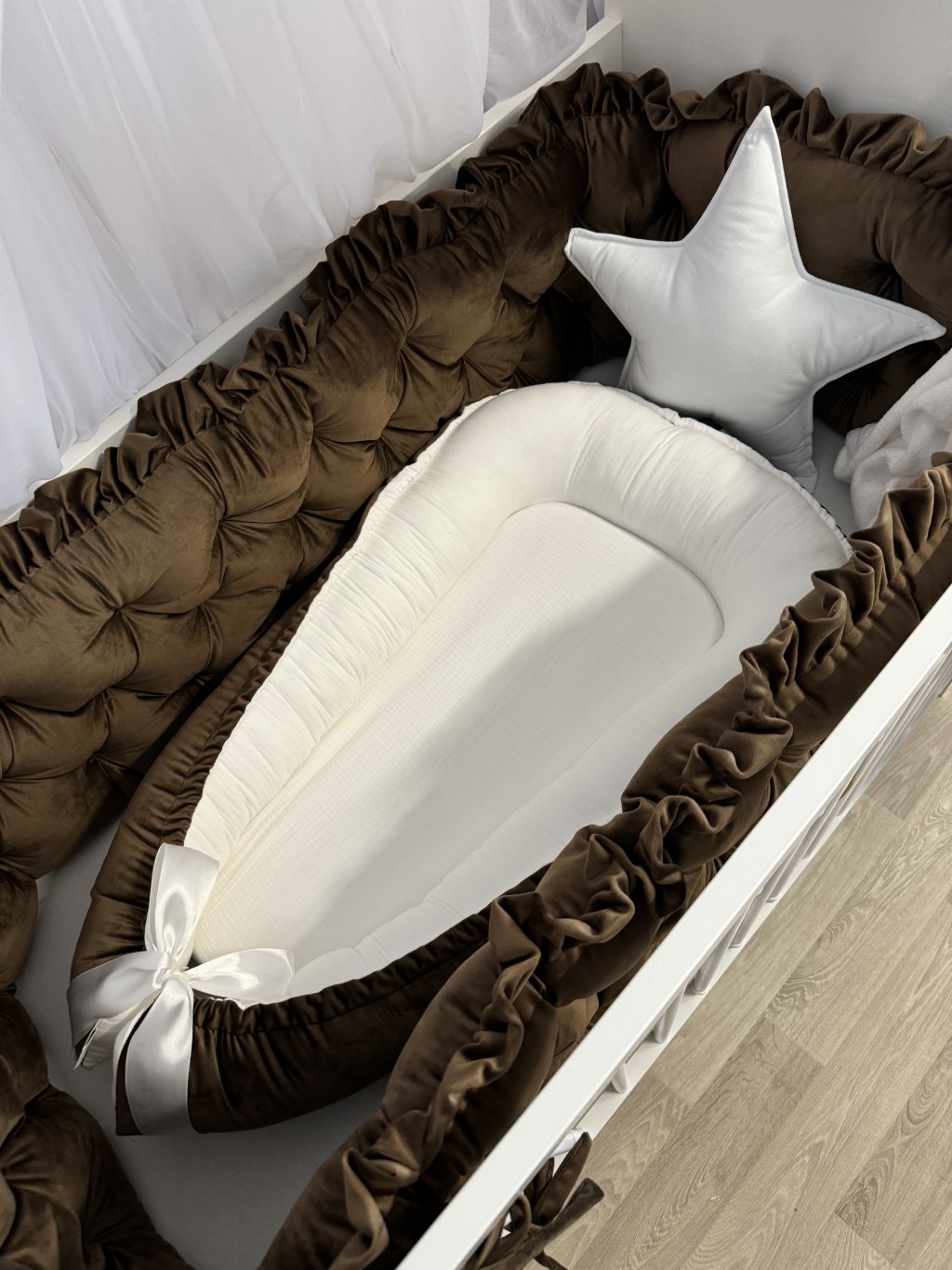 Pokud stavíte kulatou variantu postýlky, hnízdečko po vložení vyplní celý vnitřní prostor kulatého tvaru. Mantinel se v tomto případě do postýlky již nevejde, zároveň to ale není potřeba – měkké a vyvýšené boky hnízdečka plně nahrazují jeho funkci a chrání miminko před kontaktem s dřevěnými tyčkami.