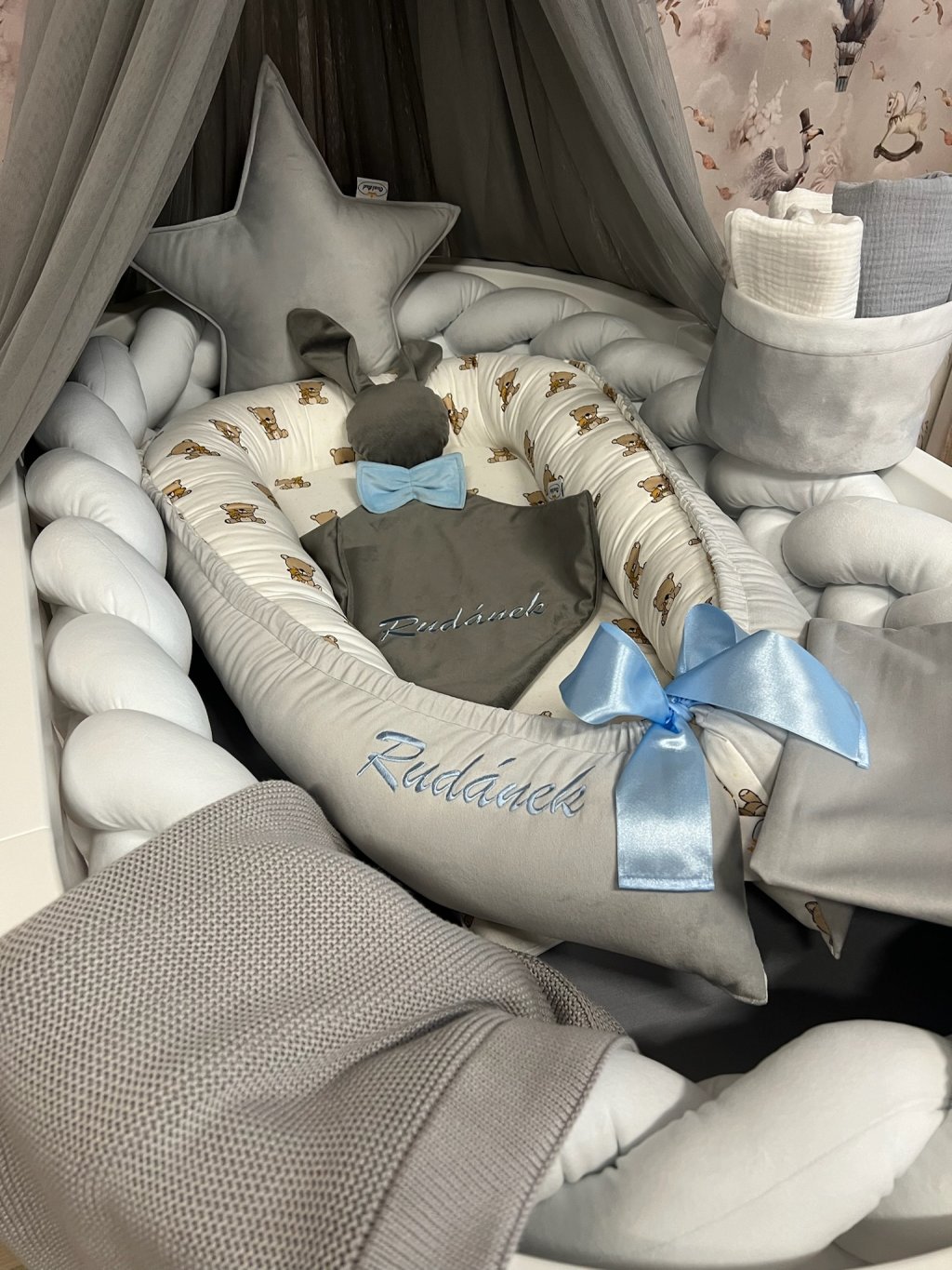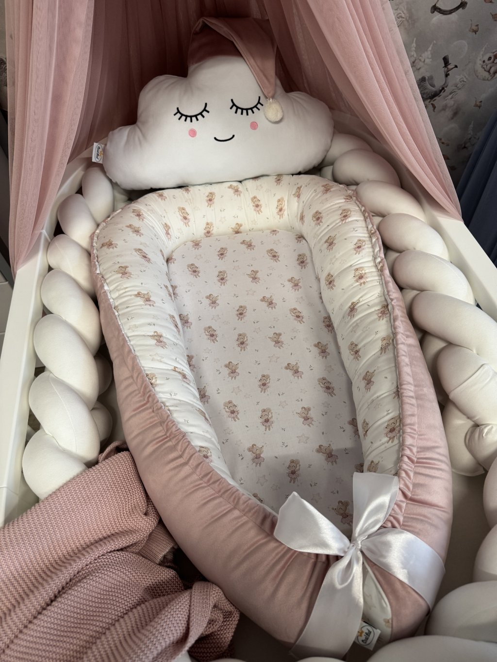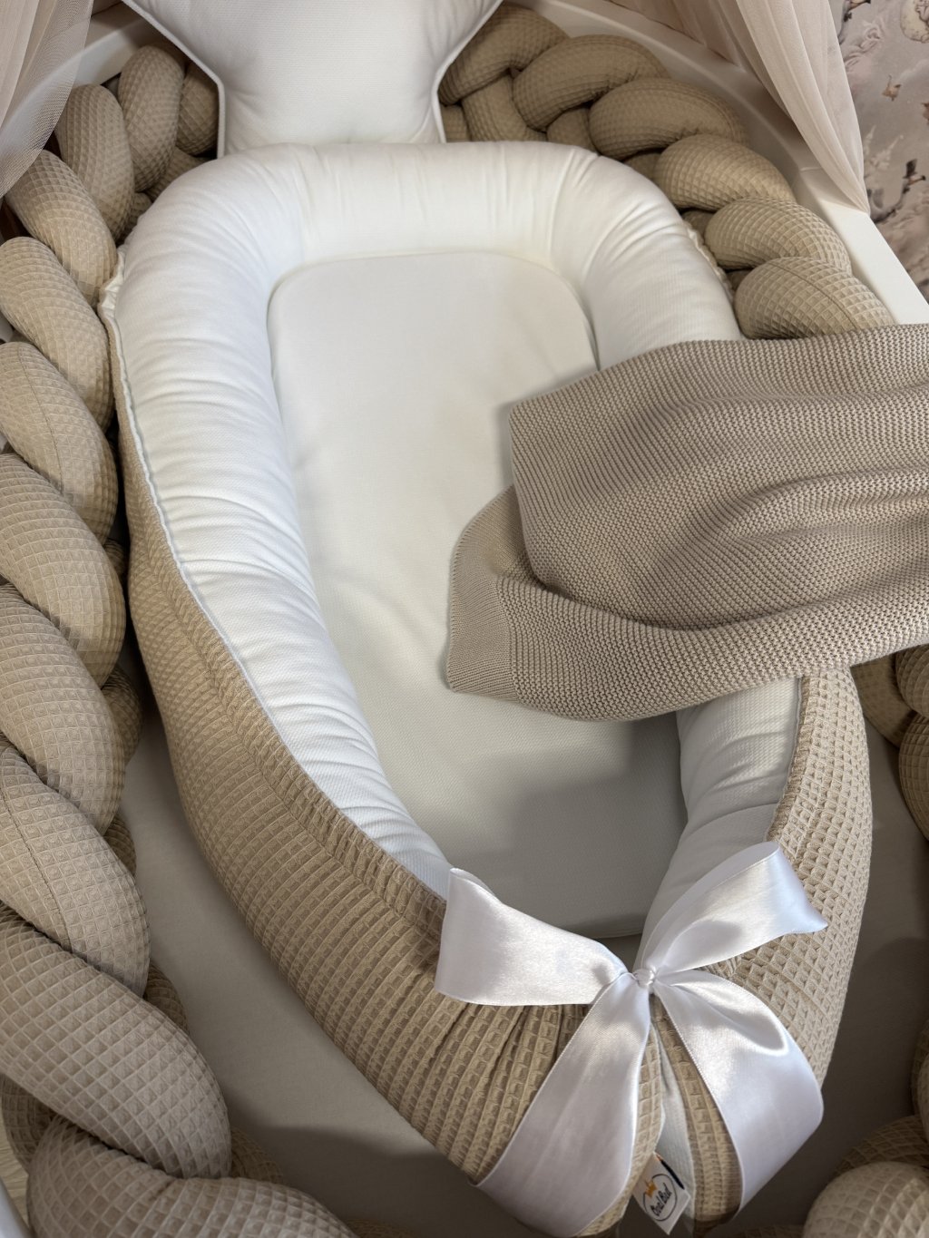 Hnízdečko lze rozvázat saténovou stuhou nebo bavlněnou šňůrkou, čímž se jeho vnitřní prostor prodlouží a přizpůsobí růstu miminka.