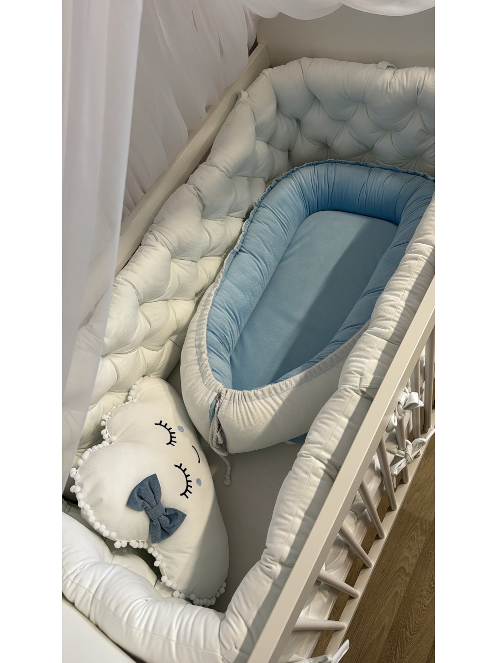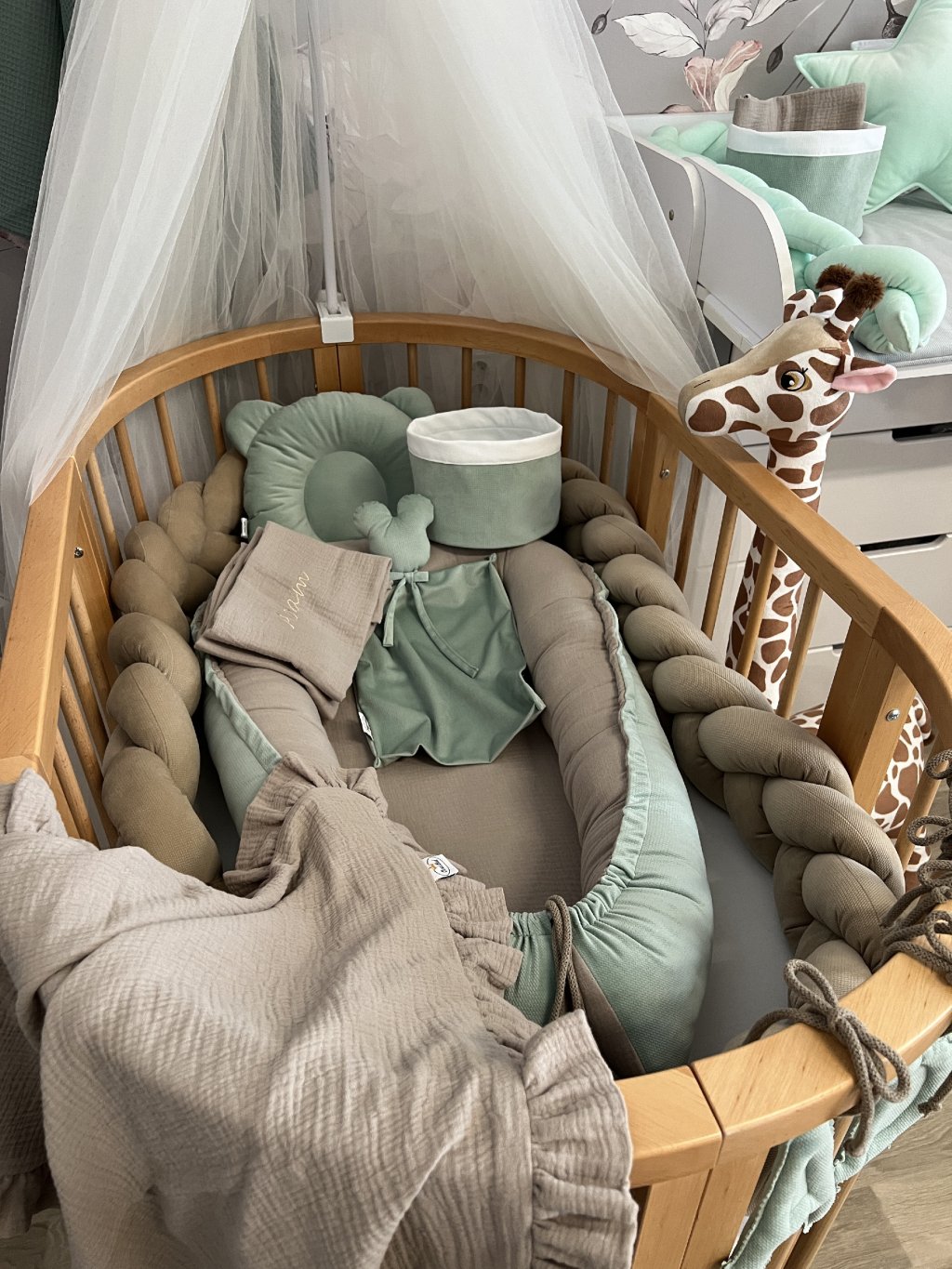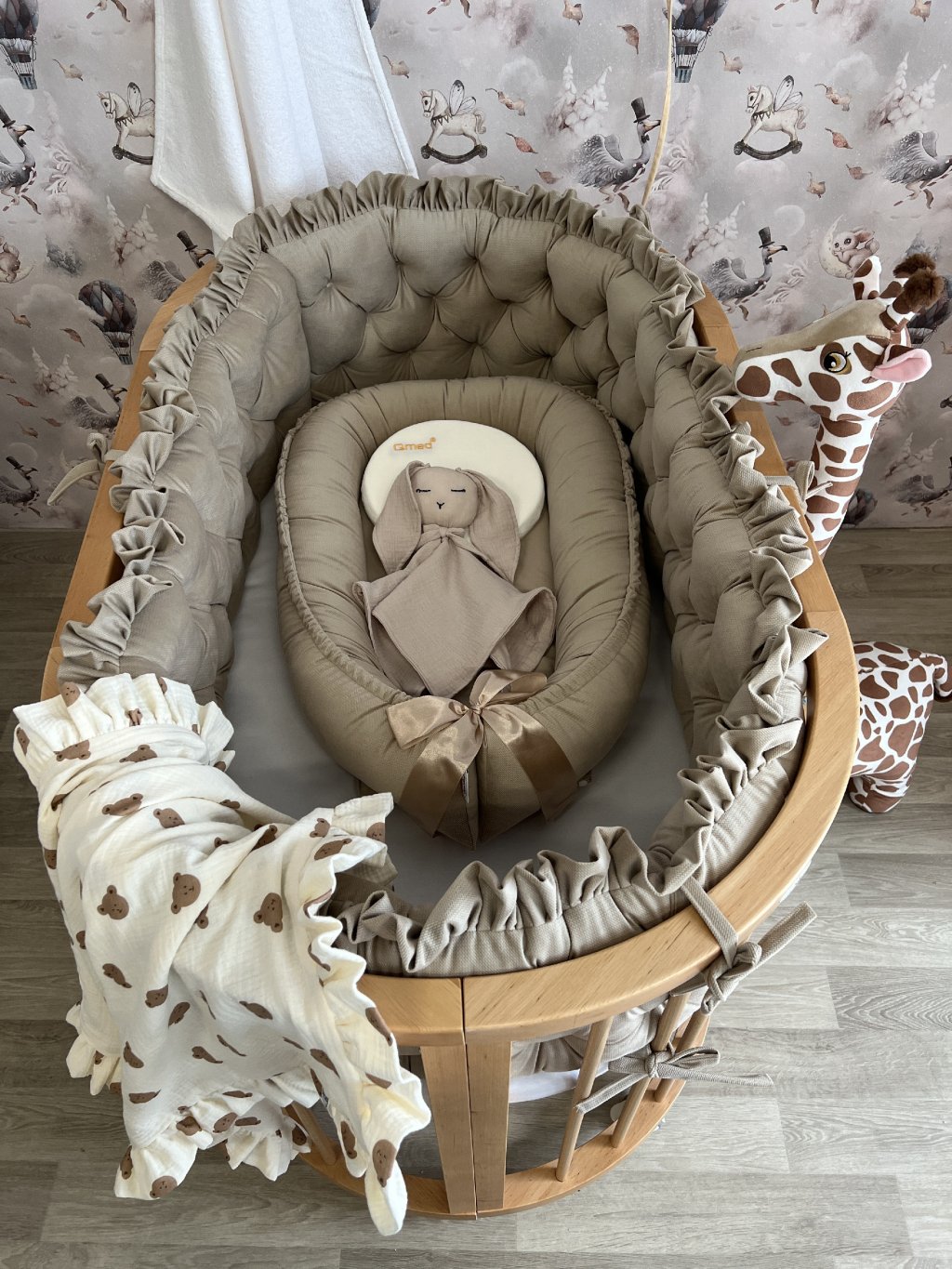 U oválné varianty postýlky je možné kombinovat hnízdečko i mantinel zároveň. Mantinel je zde praktickým doplňkem zejména ve chvíli, kdy už miminko hnízdečko přestane využívat – hnízdečko lze jednoduše nahradit mantinelem, který je krásně měkký a zabraňuje tomu, aby se děťátko bouchlo o dřevěné příčky postýlky.