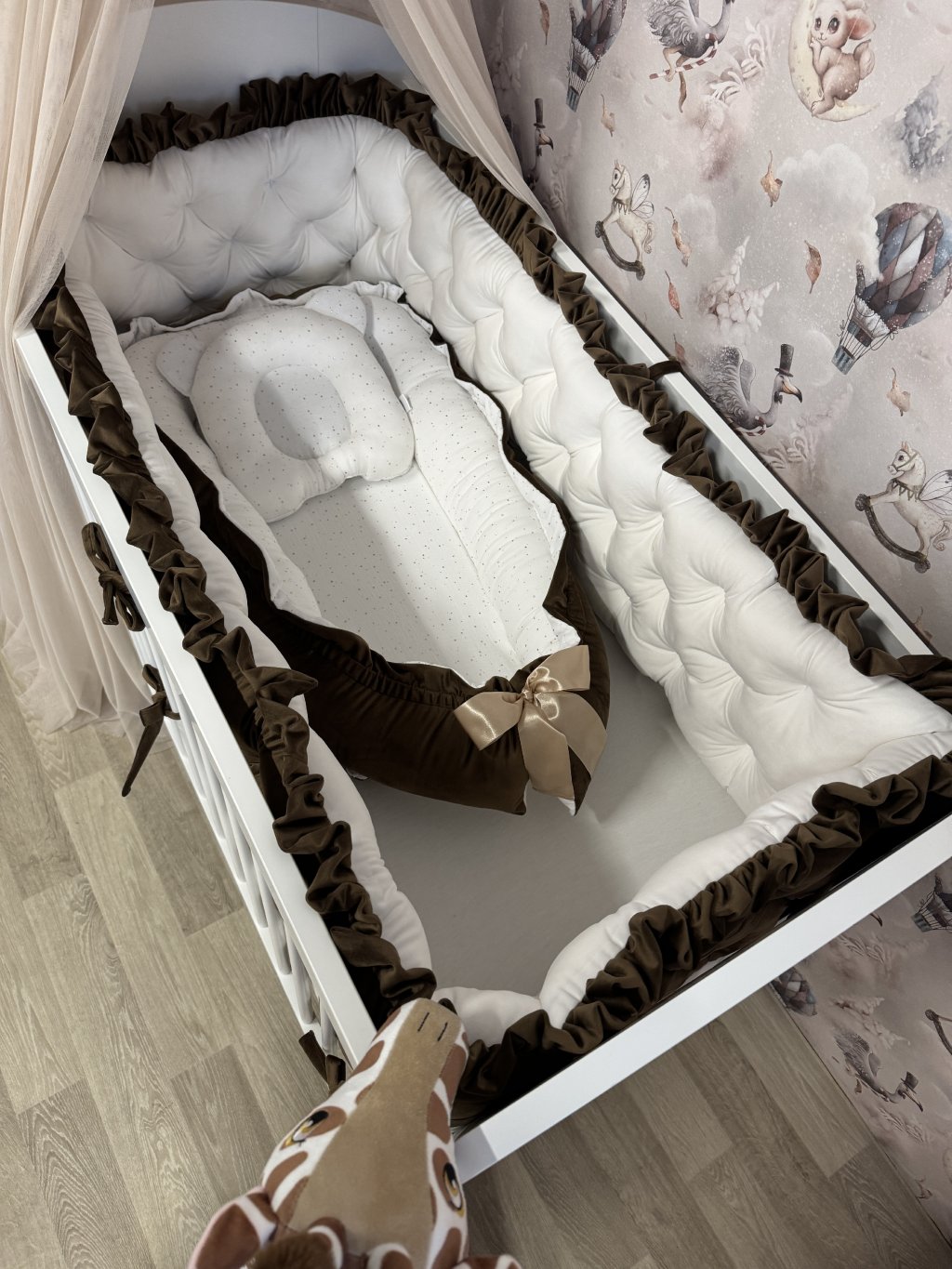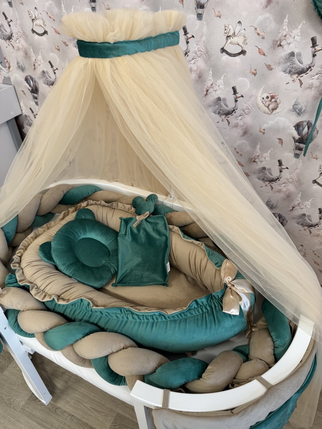 V oválné variantě postýlky je možné kombinovat hnízdečko i mantinel současně. Mantinel je zde praktickým doplňkem zejména ve chvíli, kdy už miminko hnízdečko přestane využívat – hnízdečko lze nahradit mantinelem, který je krásně měkký a zabraňuje tomu, aby se děťátko bouchlo o dřevěné příčky postýlky.