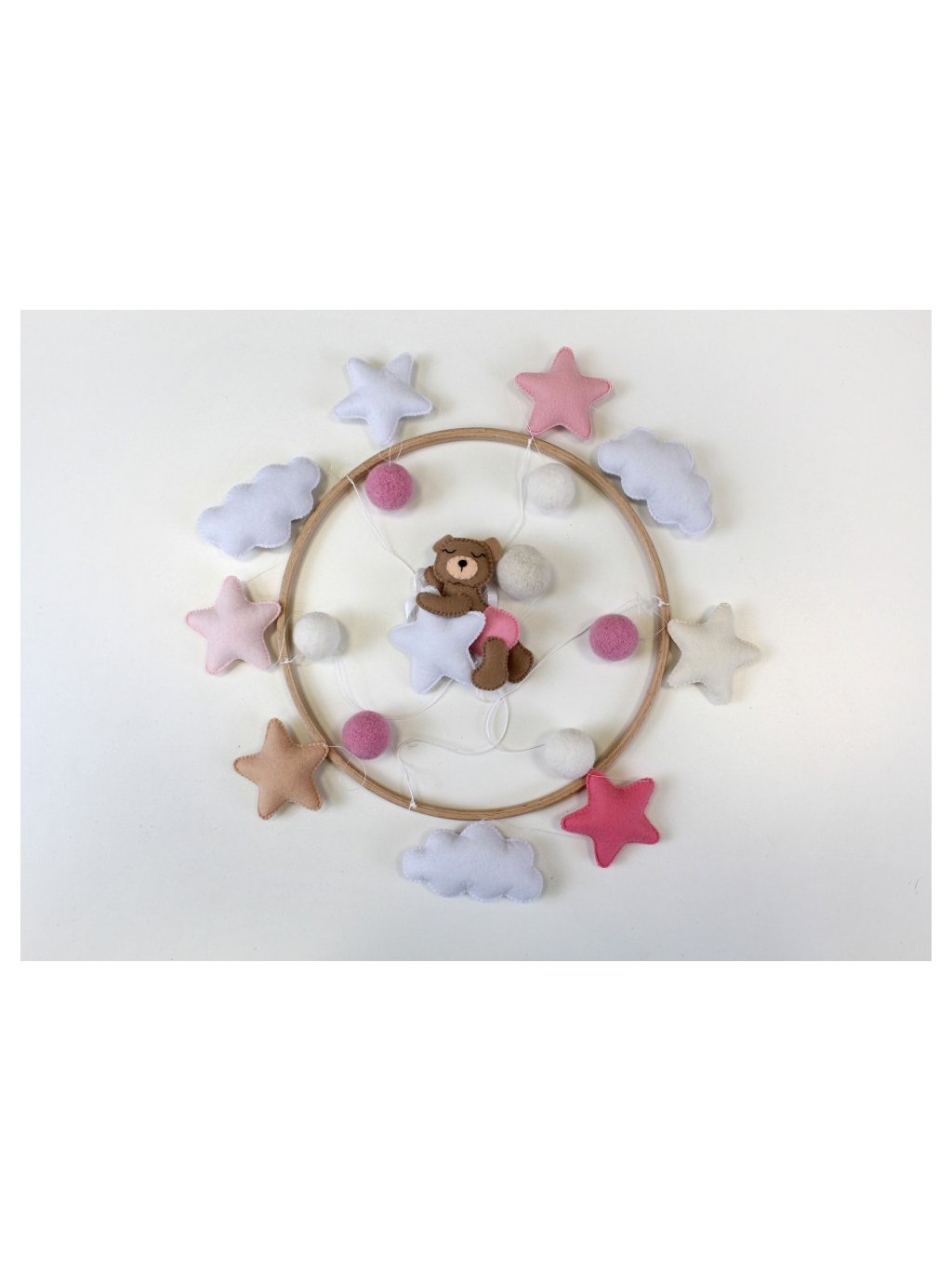 V horní části má kolotoč mašličku, pomocí které lze kolotoč na držák přivázat. Naše dřevěné držáky k postýlce mají v horní části otvor pro uvázání kolotoče.