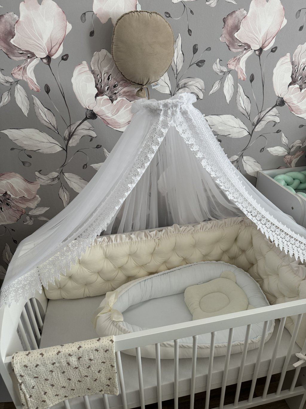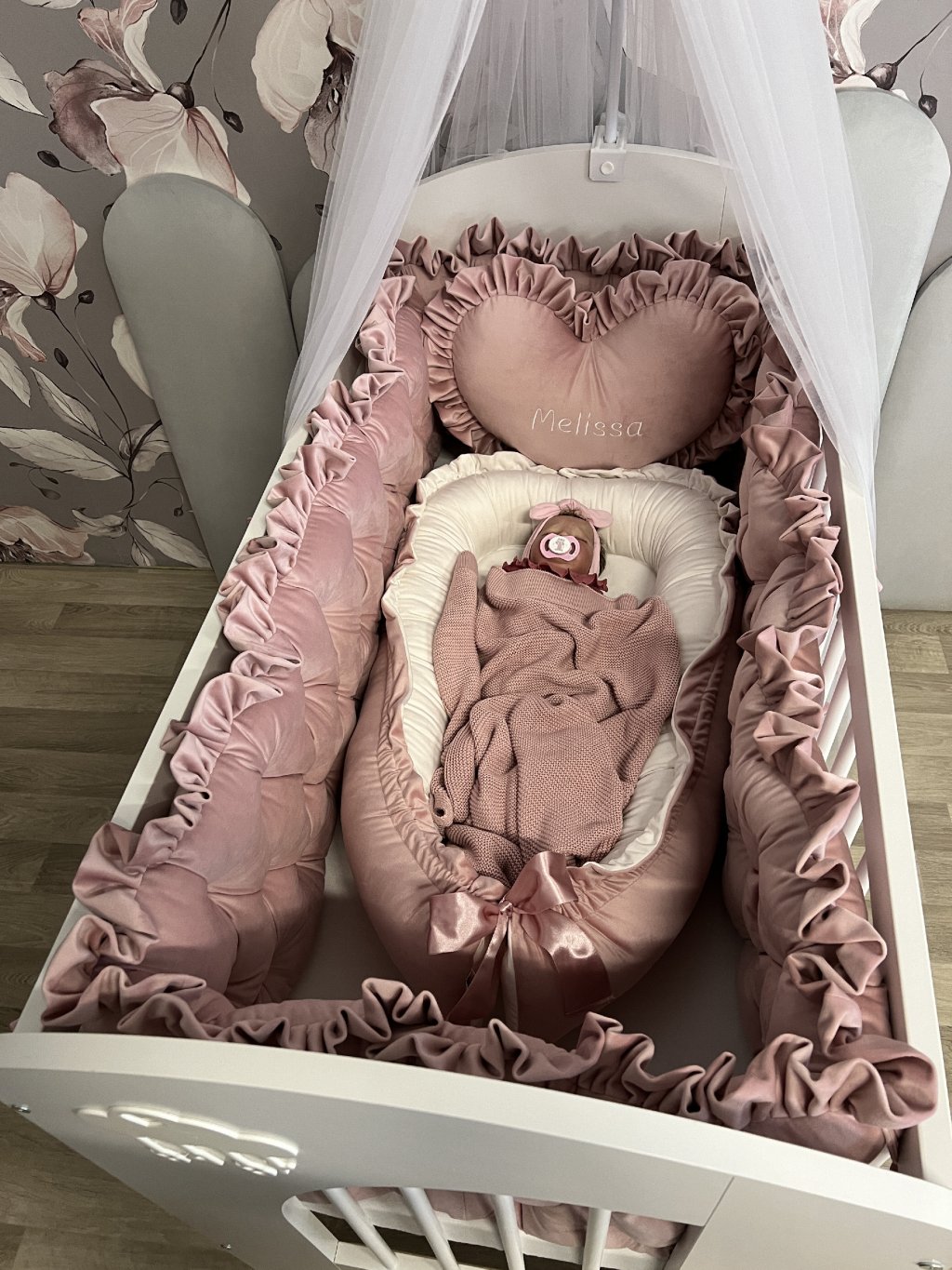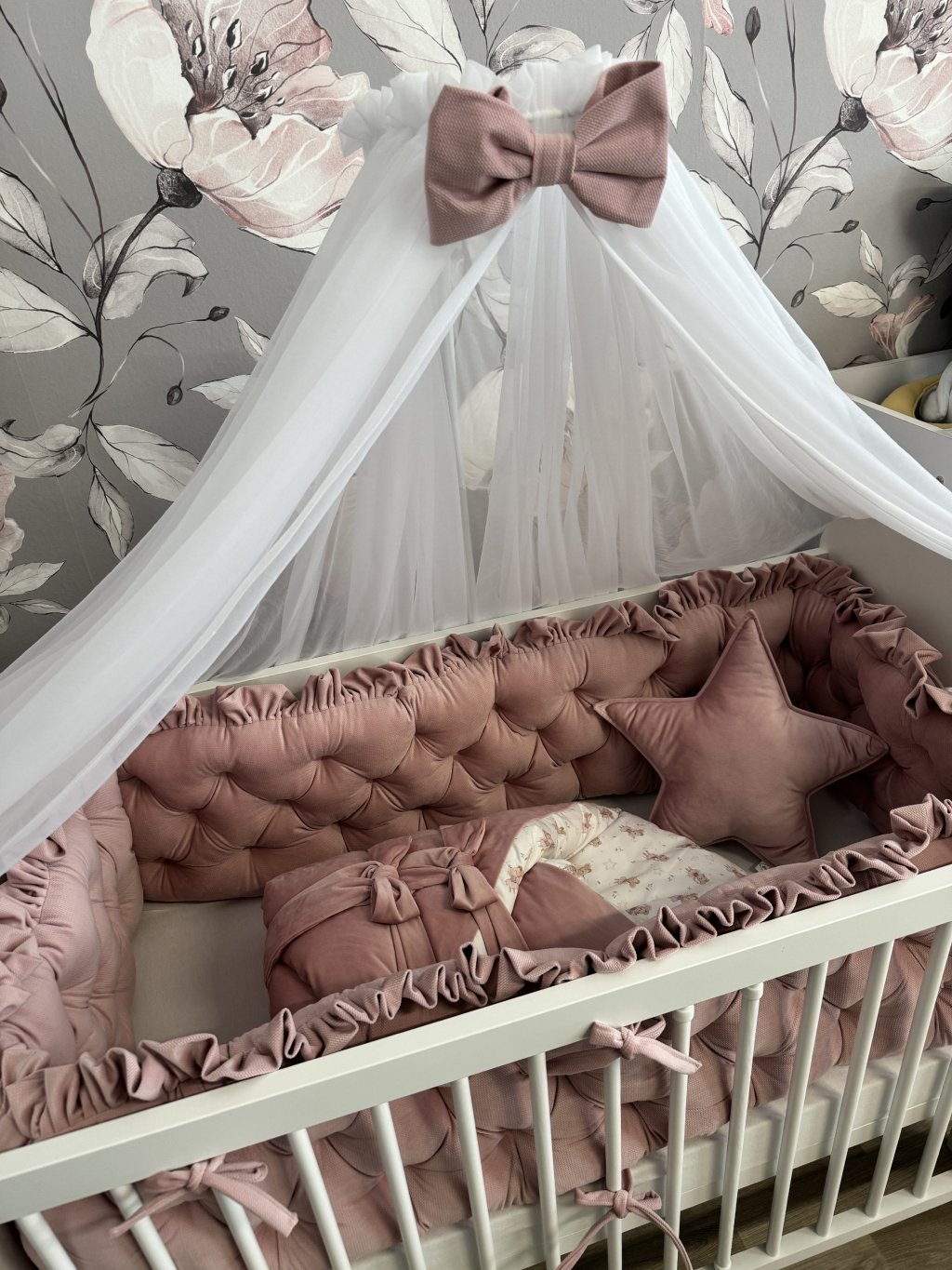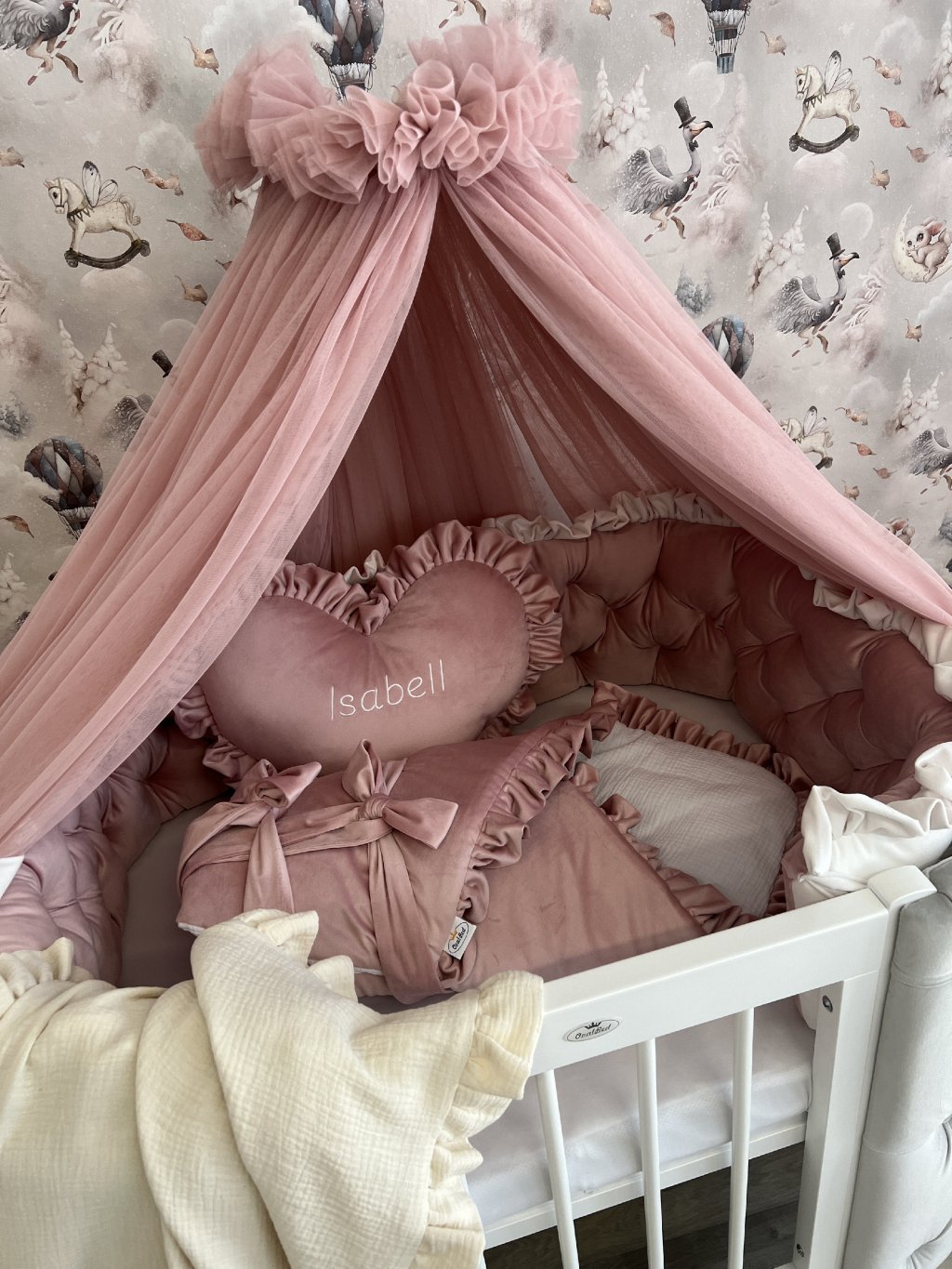 Upevnění k postýlce je řešeno pomocí úvazků., ve vrchní části je volánek.