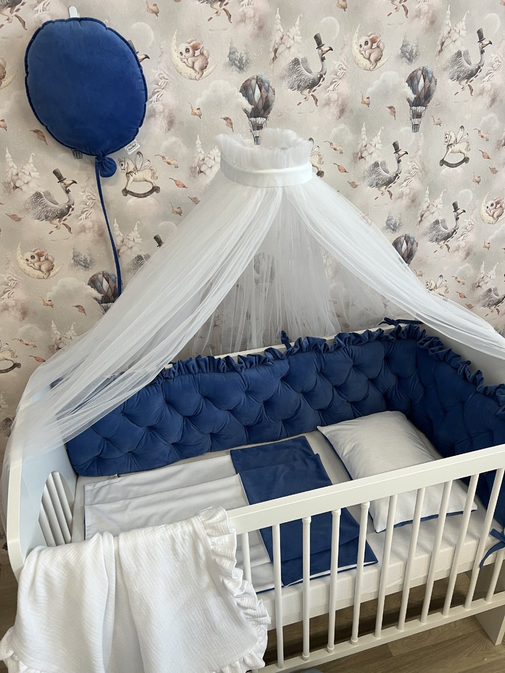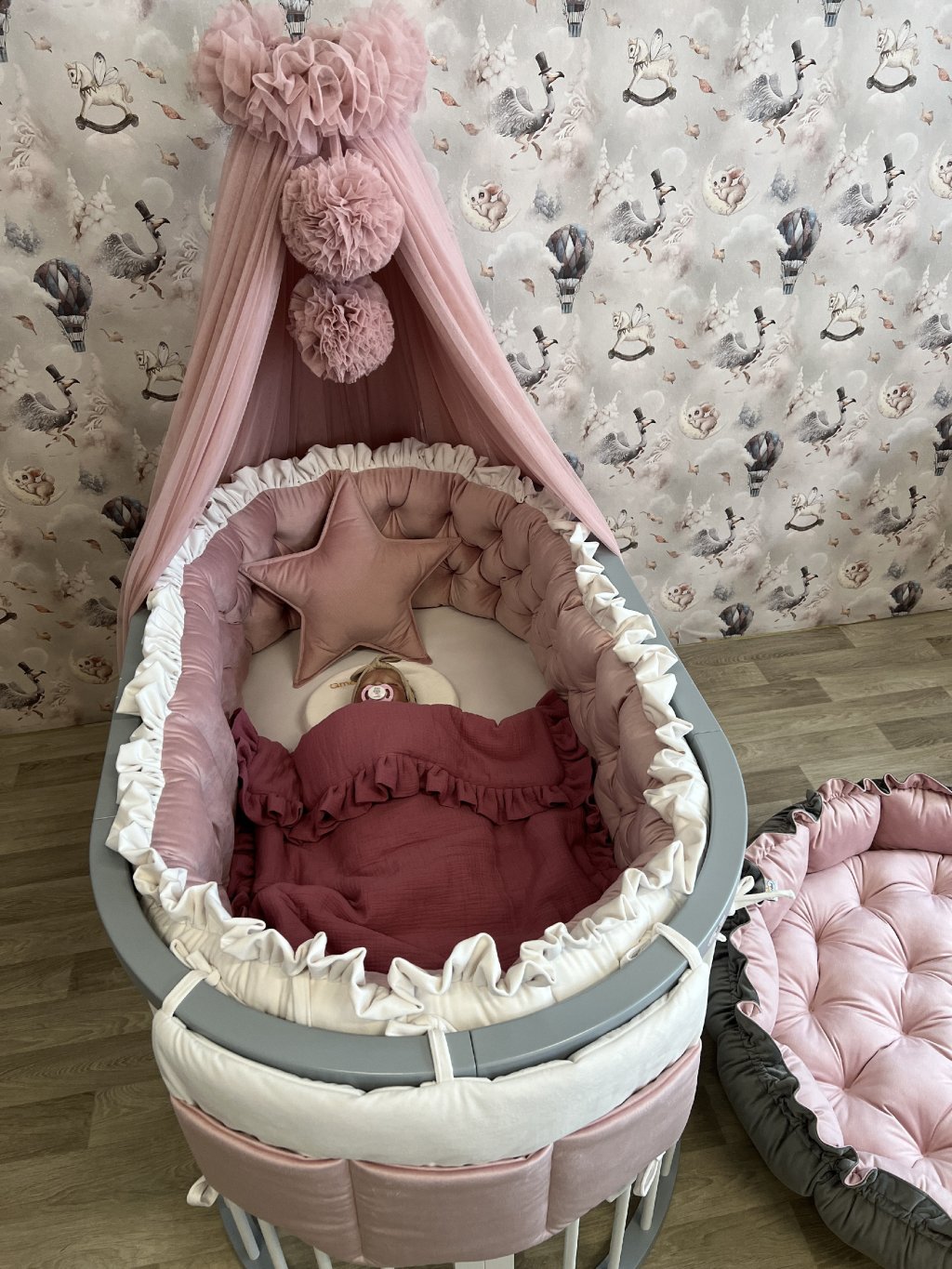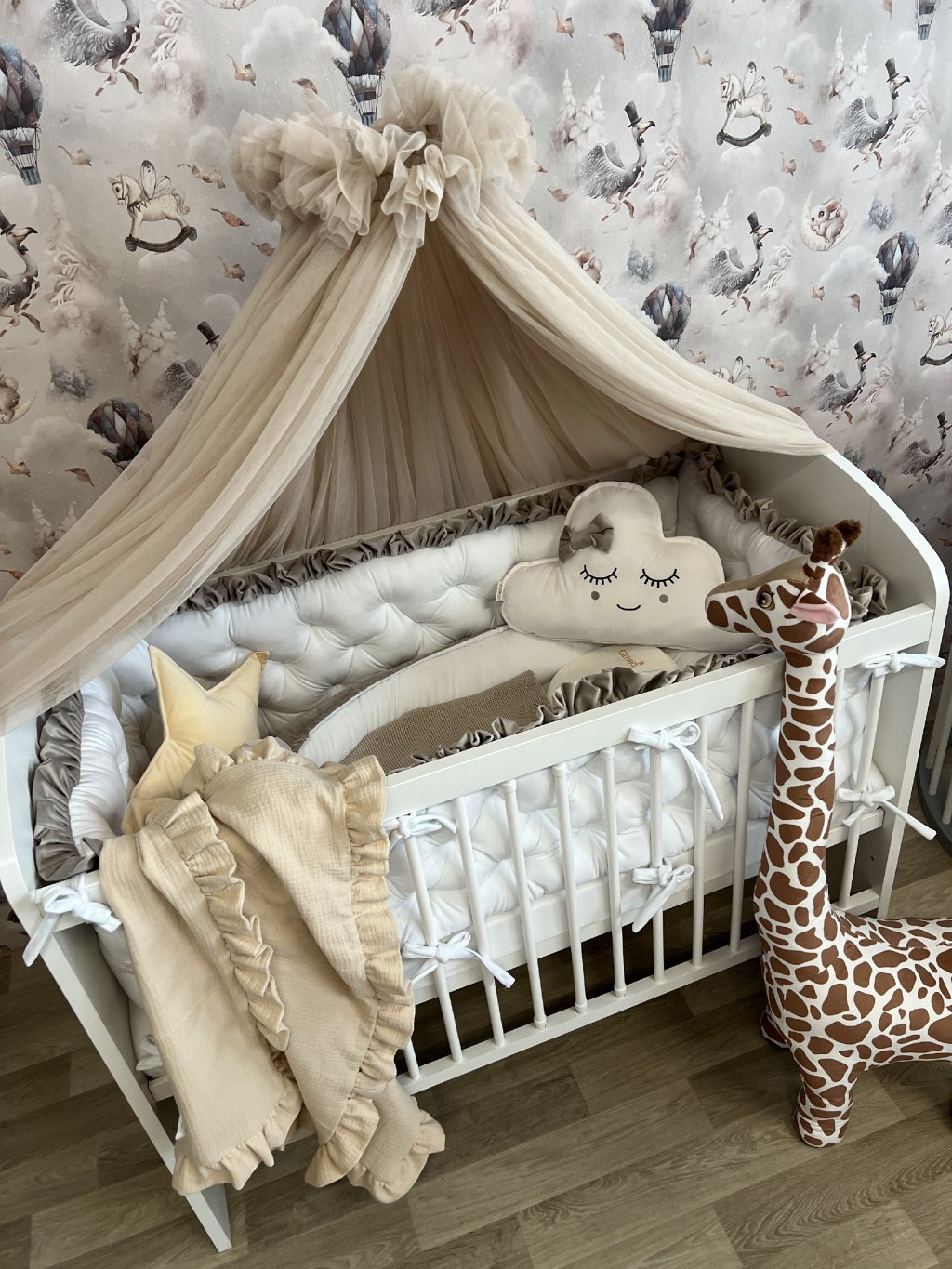 Upevnění k postýlce je řešeno pomocí úvazků., ve vrchní části je volánek.