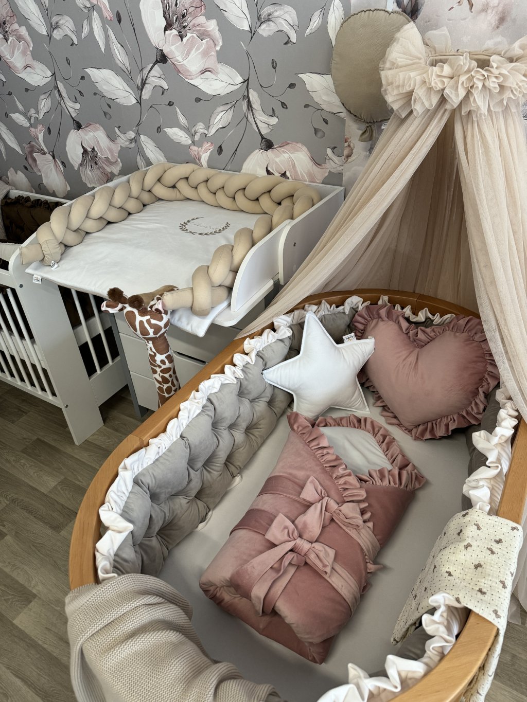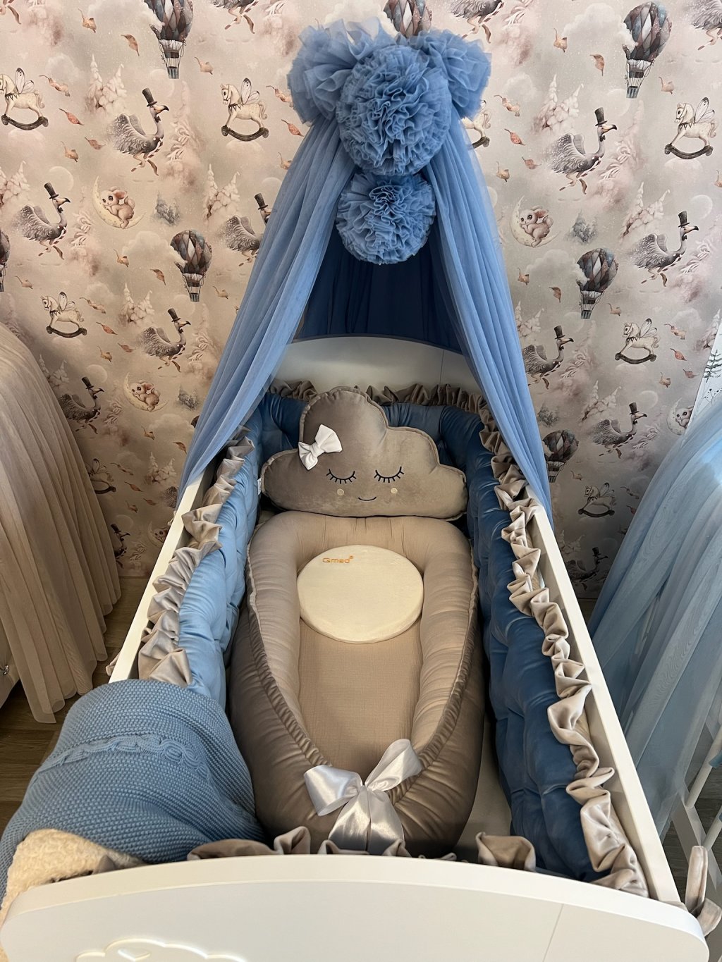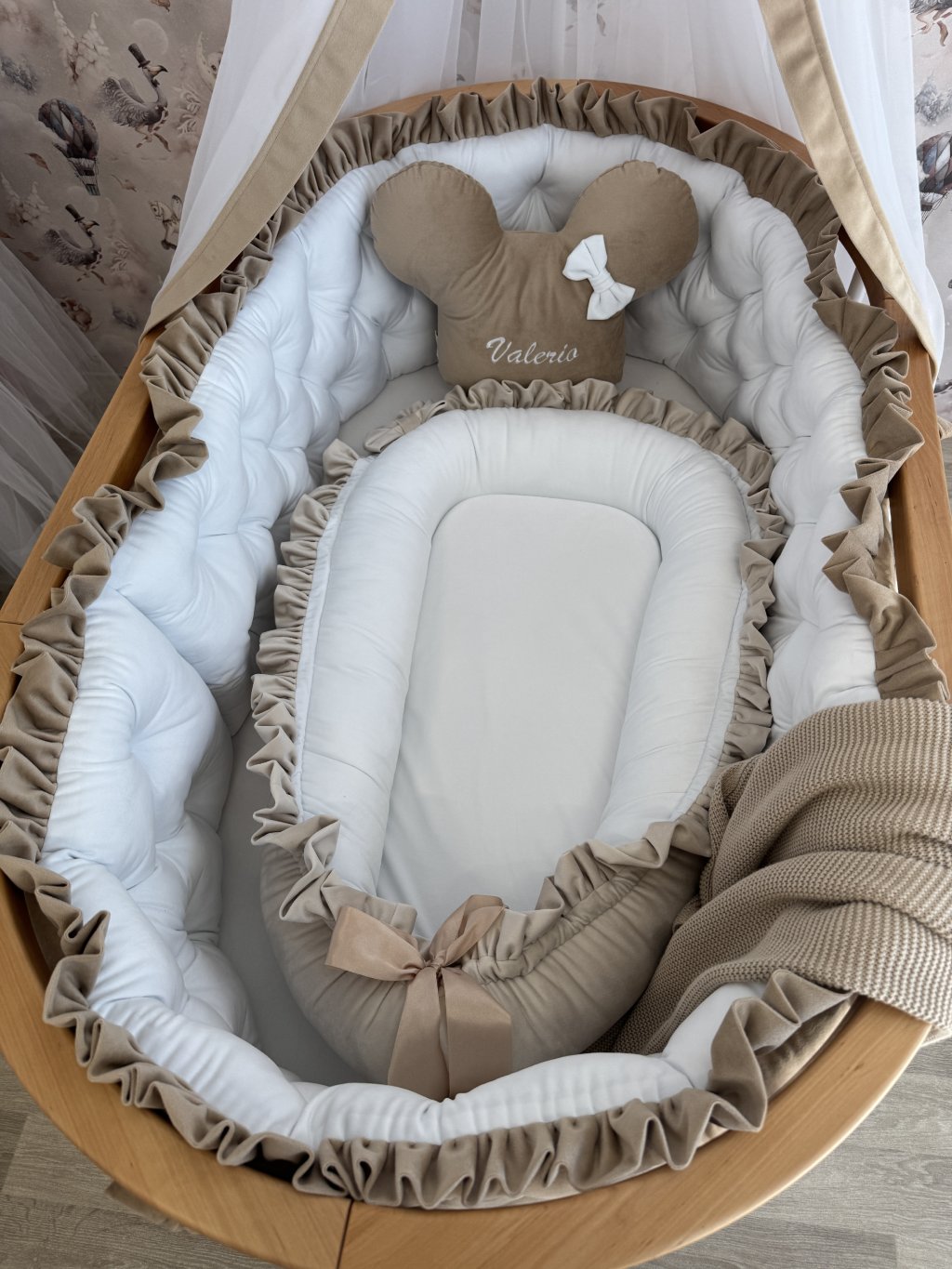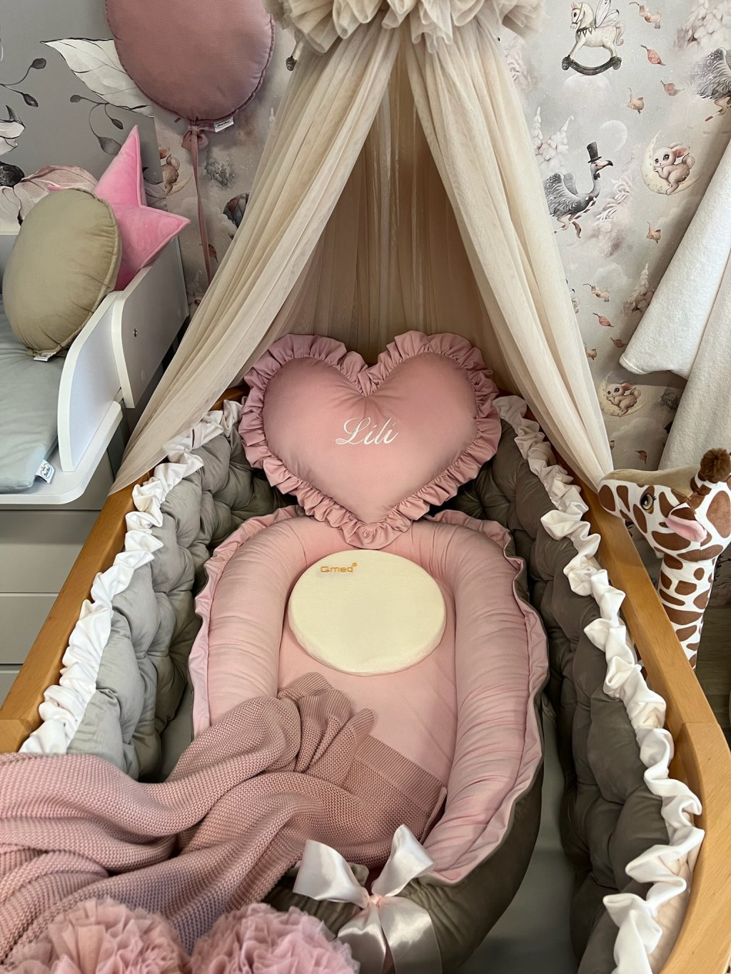 Upevnění k postýlce je řešeno pomocí úvazků., ve vrchní části je volánek.