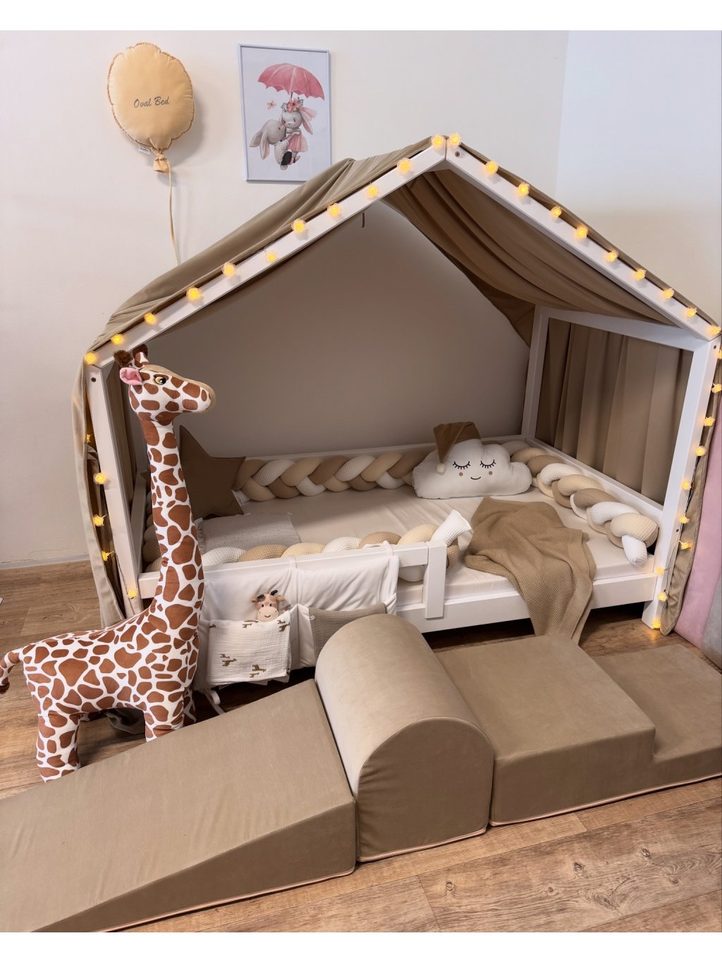 Materiál je velmi příjemný na dotyk, odolný a krásně drží tvar. Nebesa jsou opatřena látkovými úvazky, pomocí kterých je lze snadno připevnit na několika místech ke konstrukci domečkové postele. Každý kus šijeme individuálně na mírupodle rozměrů konkrétní postele. Na přání rádi ušijeme nebesa i pro jiné typy domečkových postelí – stačí nás kontaktovat a domluvíme detaily dle Vašich představ.