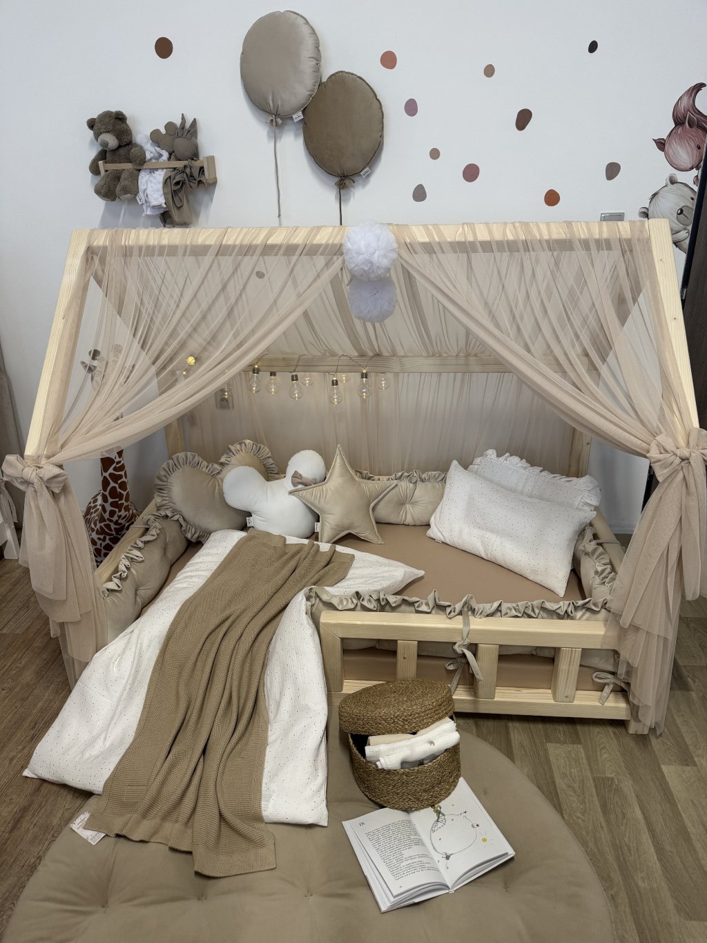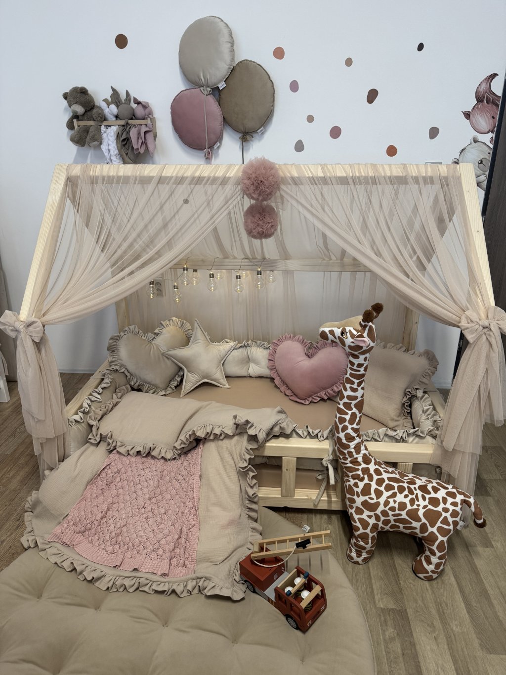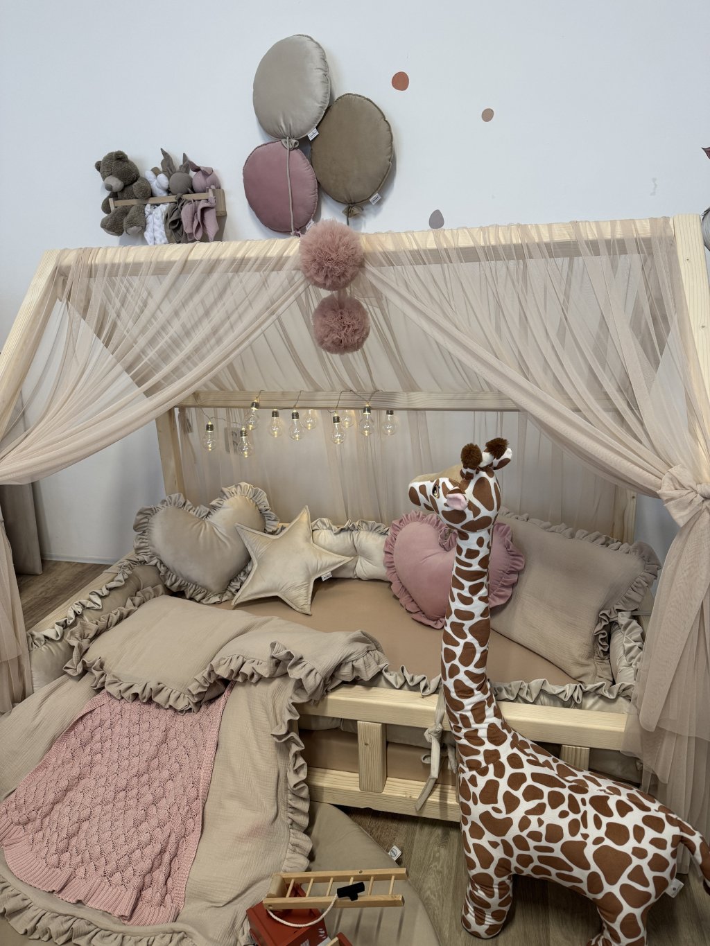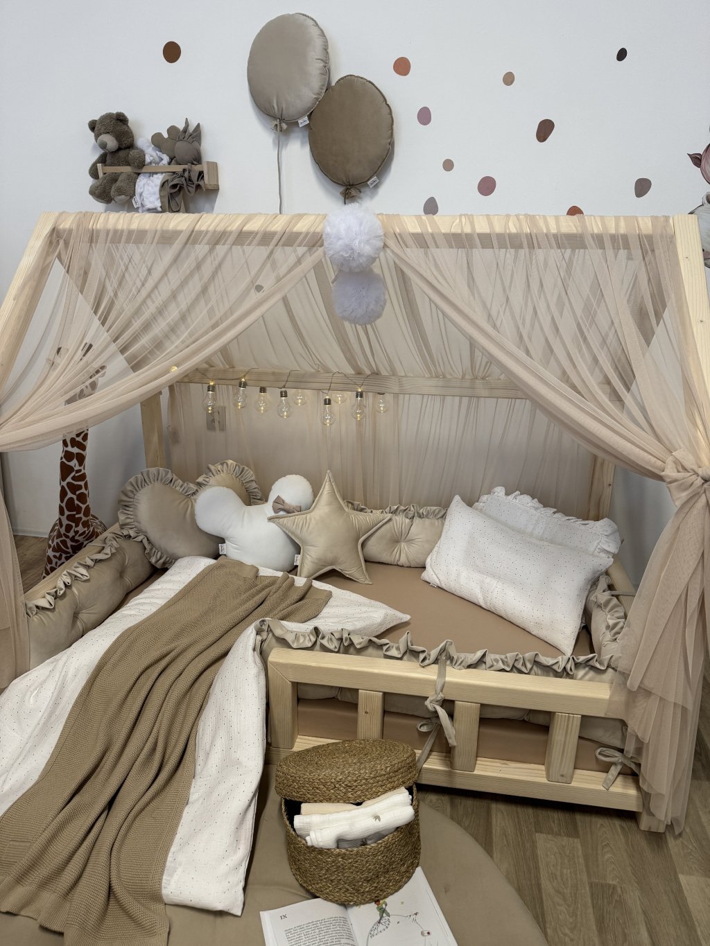 Nebesa jsou opatřena úvazky, pomocí kterých je lze snadno připevnit na několika místech ke konstrukci domečkové postele. Každý kus šijeme individuálně na míru podle rozměrů konkrétní postele. Na přání rádi ušijeme nebesa i pro jiné typy domečkových postelí – stačí nás kontaktovat a domluvíme detaily dle Vašich představ.