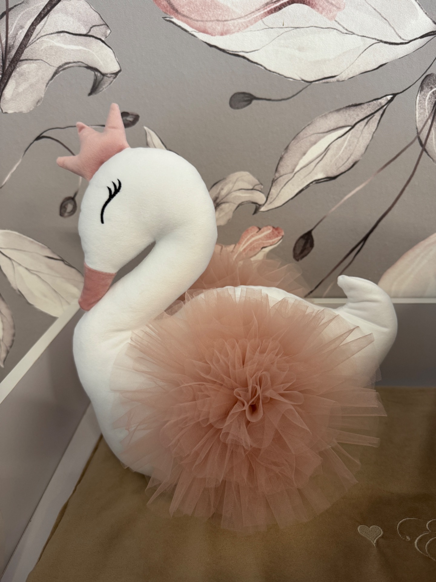 Krásný dekorační polštářek ve tvaru labutě s korunkou.
