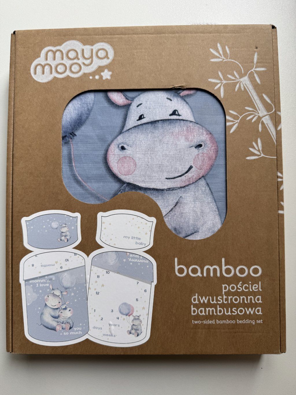 Dětské bambusové povlečení do postýlky s roztomilým hrochem, ladané do modra. Motiv peřiny je z každé strany jiný. Povlečení má zapínání na zip.