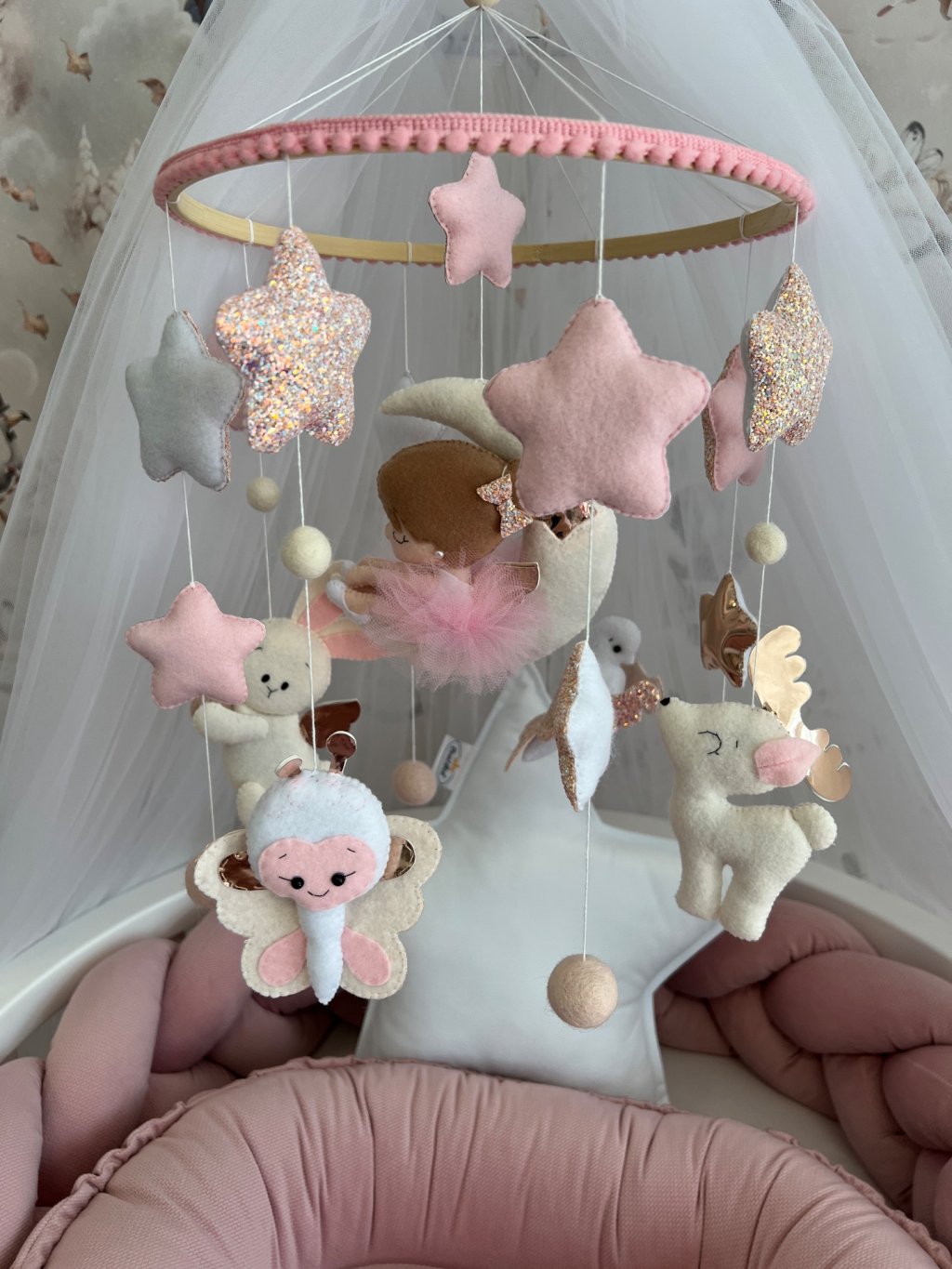 Kolotoč je stylovým a praktickým doplňkem nad dětskou postýlkou. Kolotoč je vhodný na náš dřevěný nebo kovový držák nebes, na který lze kolotoč připevnit.