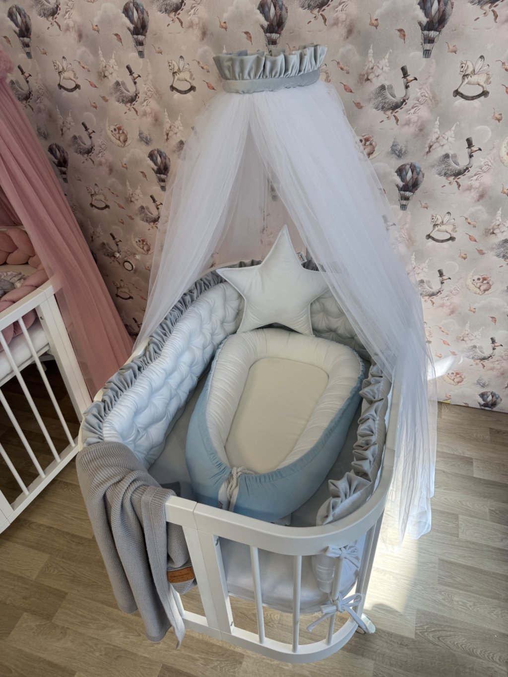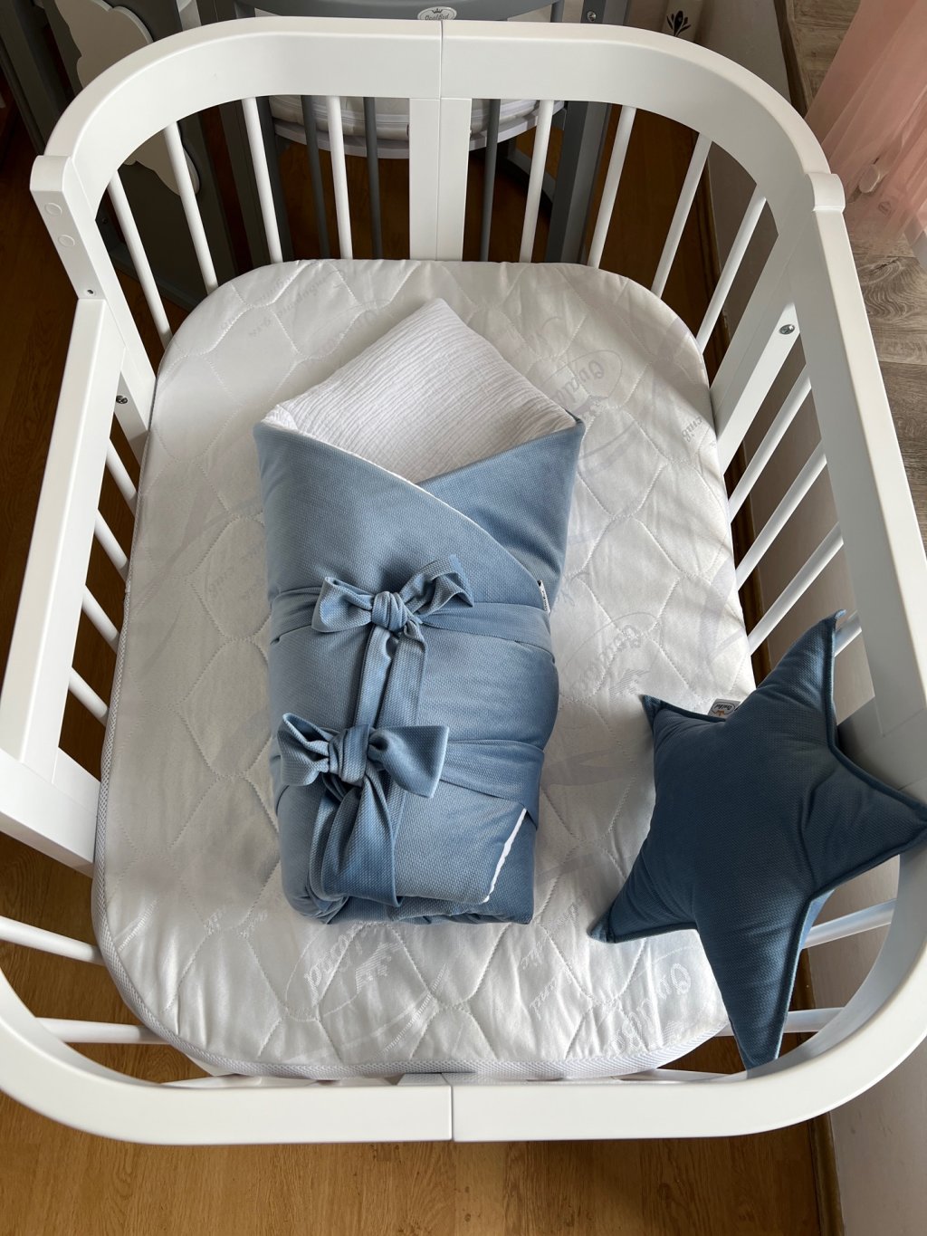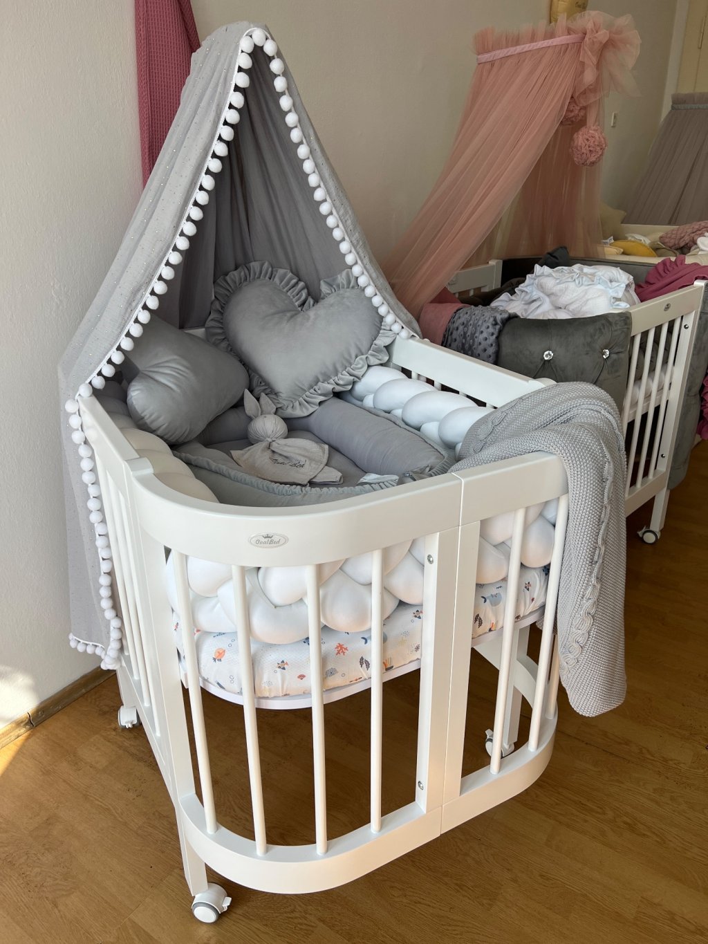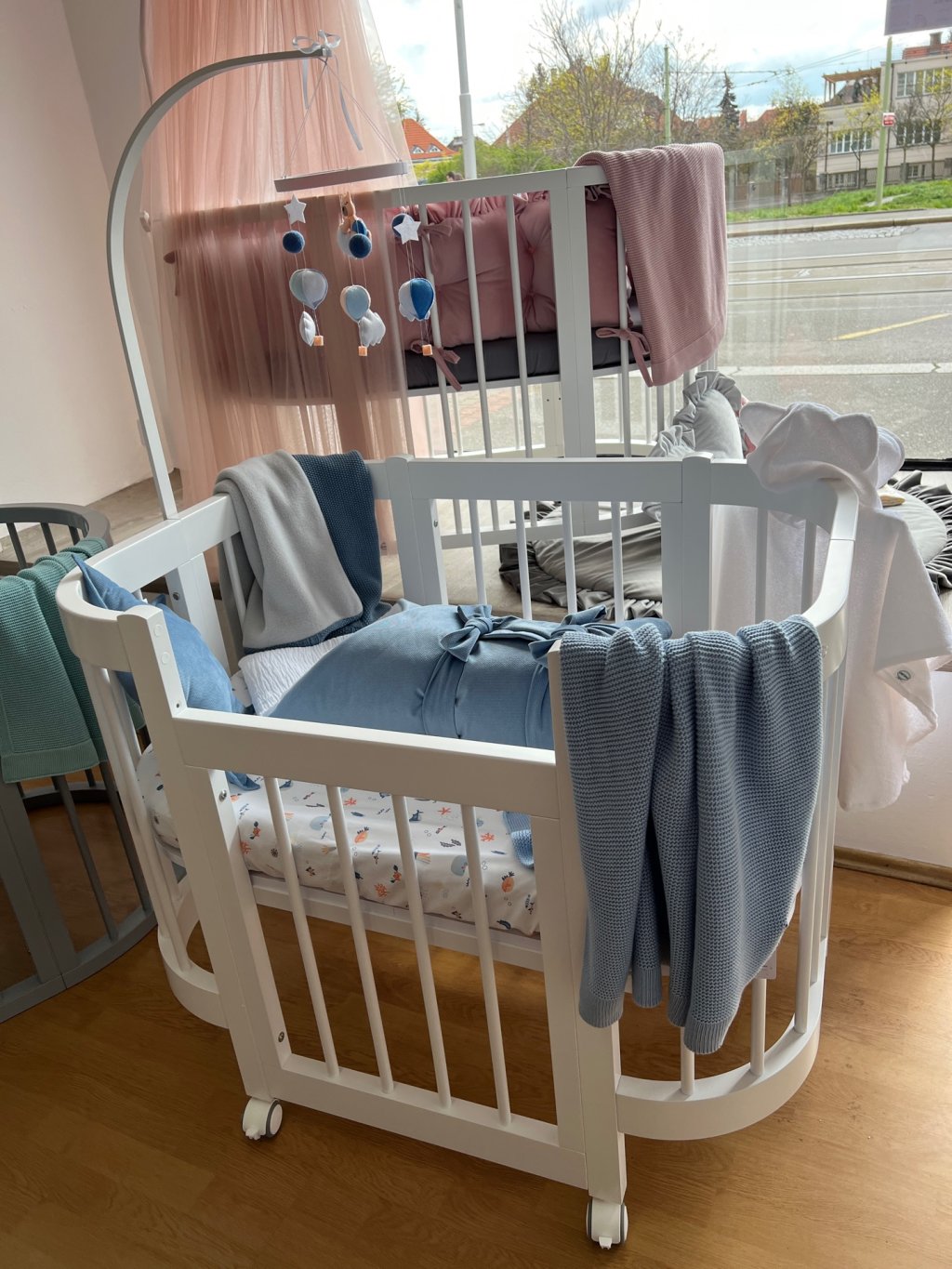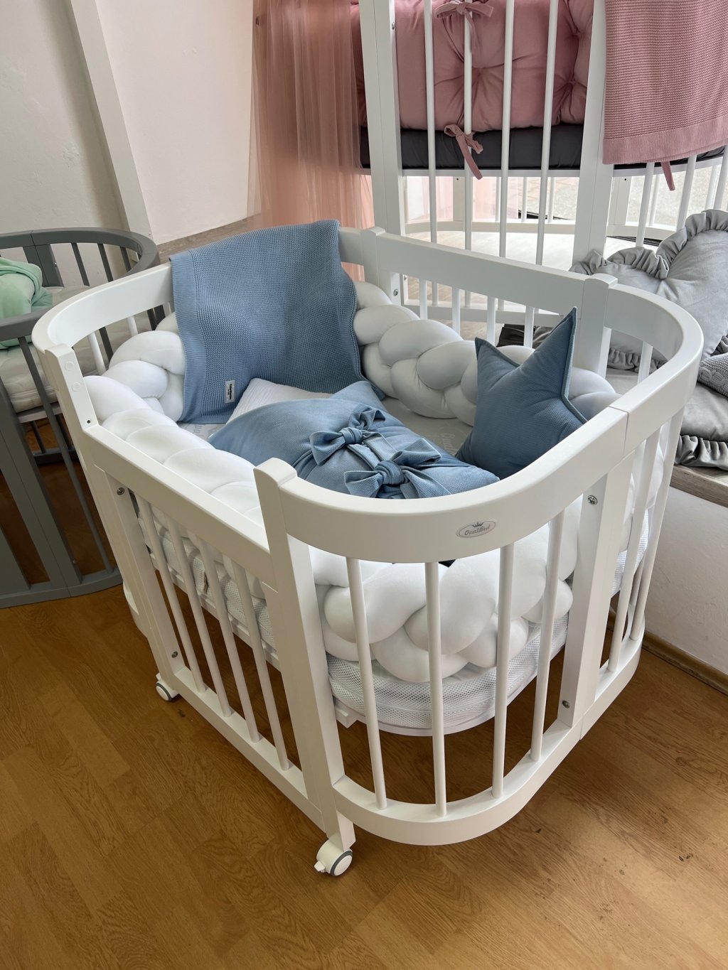 - Kvalitní pogumovaná bílošedá kolečka s aretací již v ceně. Kolečka jsou ideální pro první měsíce života (cca do 6 měsíců) poté kolečka z postýlky odmontujte.