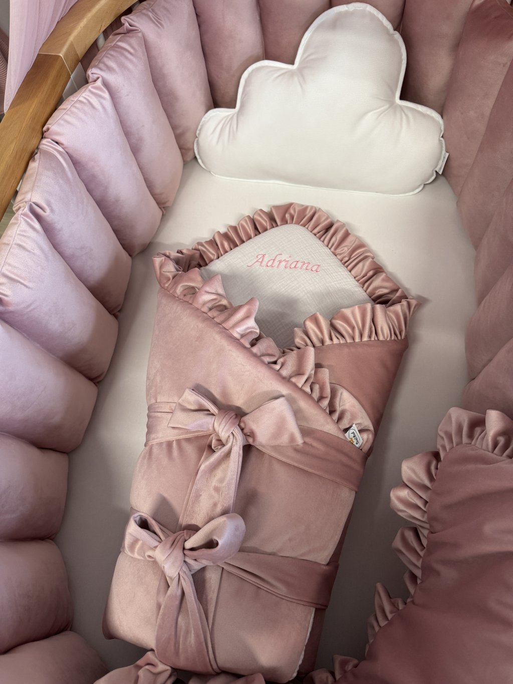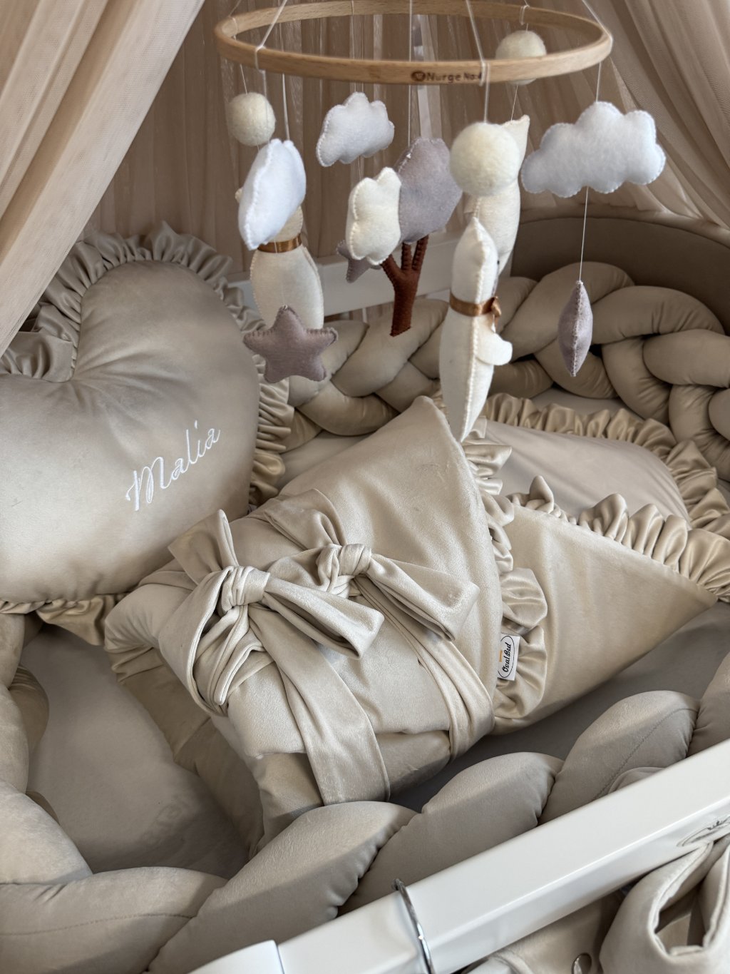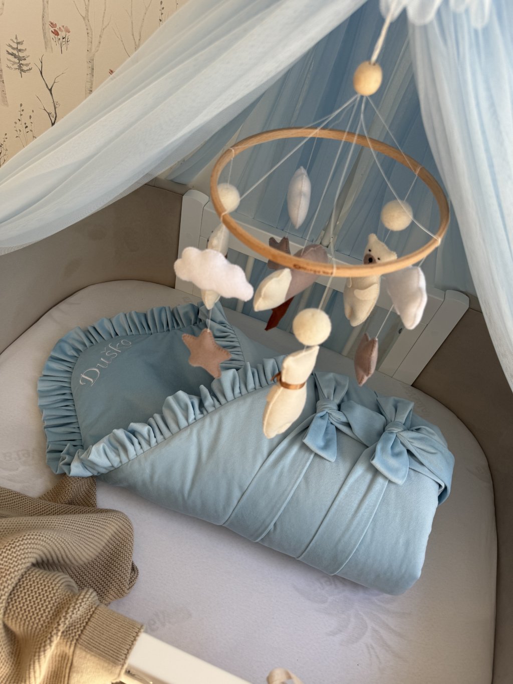 Výšivku umisťujeme na vnitřní stranu nad hlavičku miminka, aby byla viditelná a zároveň jemná k dětské pokožce. Ideální volba také jako osobní a krásný dárek k narození miminka.