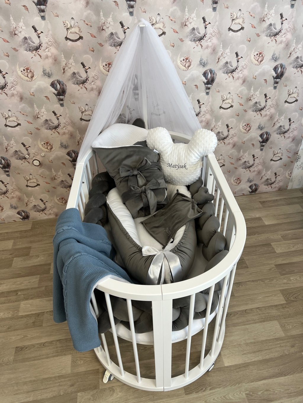 Uzlový mantinel do postýlky - na výběr máte materiál - bavlna, vafle, minky a rozměr buď 220+100 cm (do kulaté a oválné postýlky) nebo 270+50 cm (otevřené přední čelo = pohovka + oválná postýlka) a nebo 320 cm (vcelku do oválné postýlky).